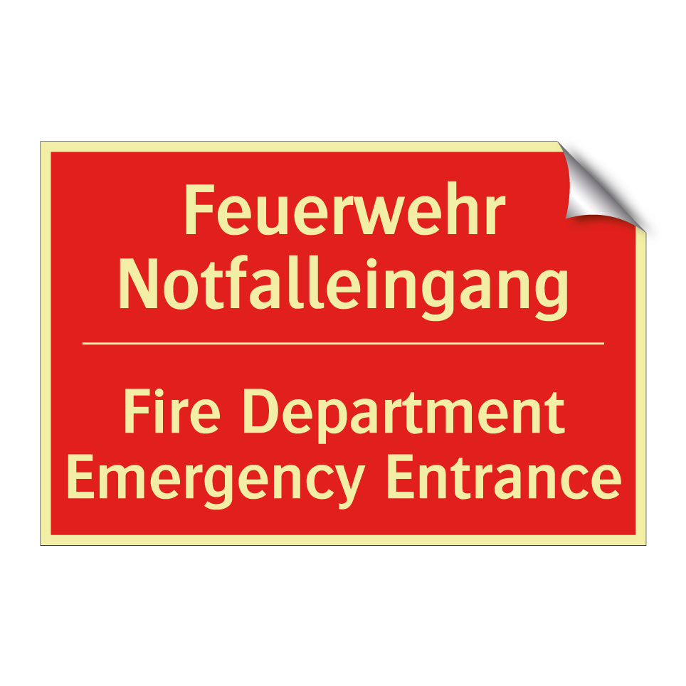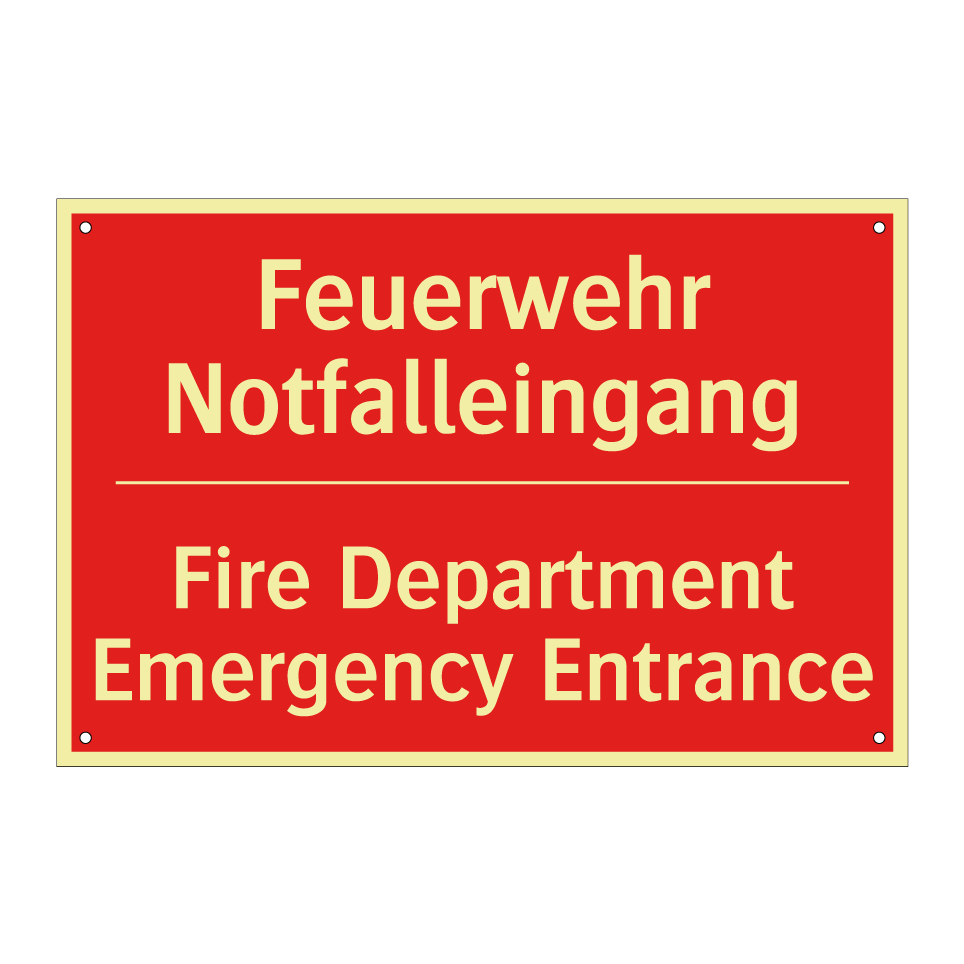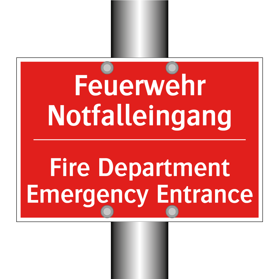 Zweisprachiges Brandschutzschild mit deutschem Text Feuerwehr Notfalleingang und englischem Text Fire Department Emergency Entrance