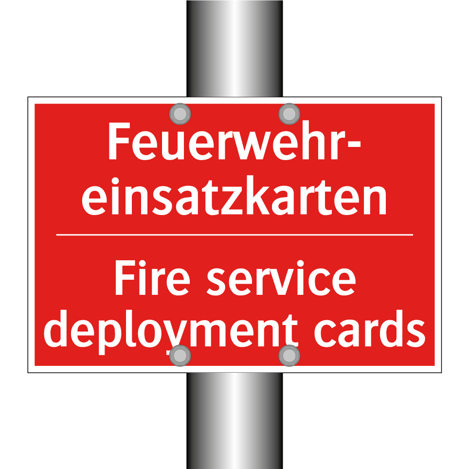 Zweisprachiges Brandschutzschild mit deutschem Text Feuerwehr- einsatzkarten und englischem Text Fire service deployment cards