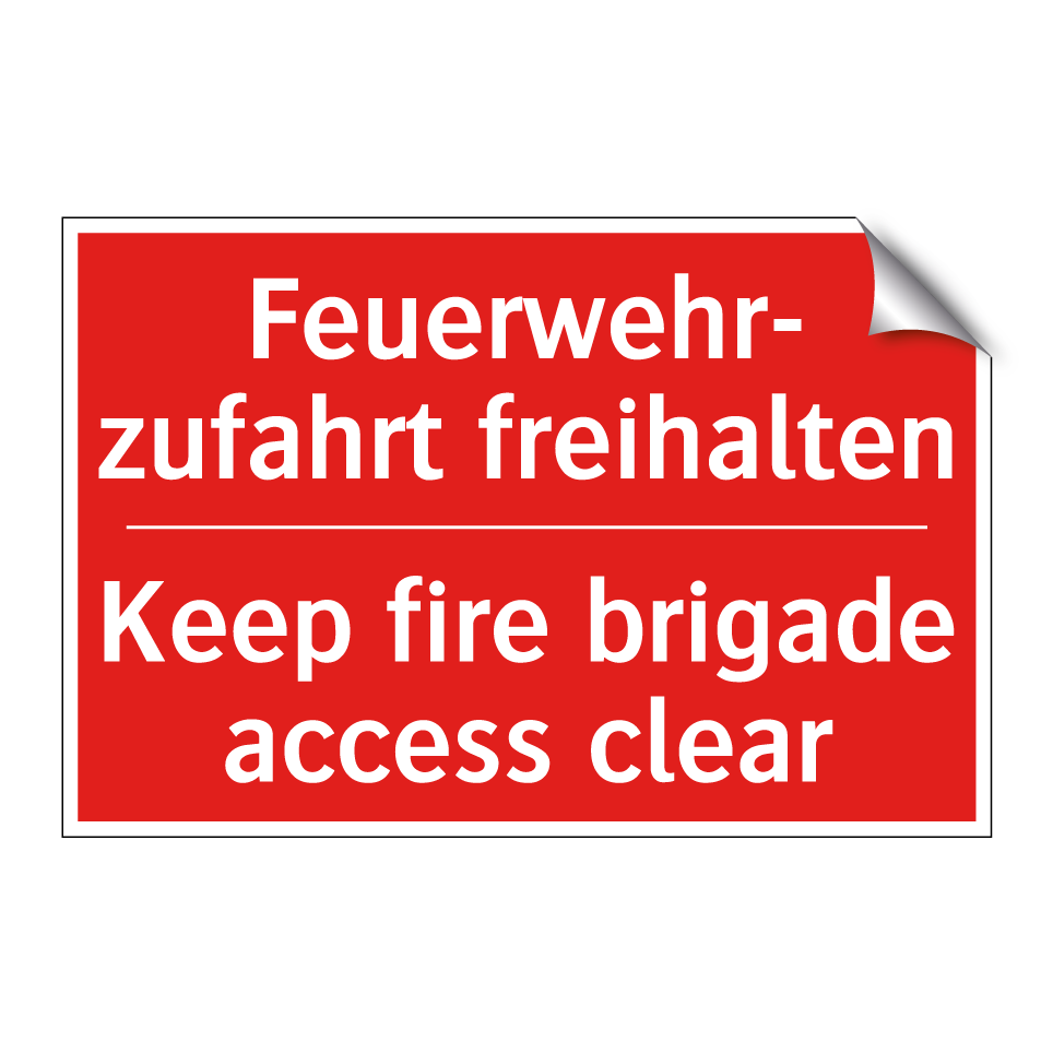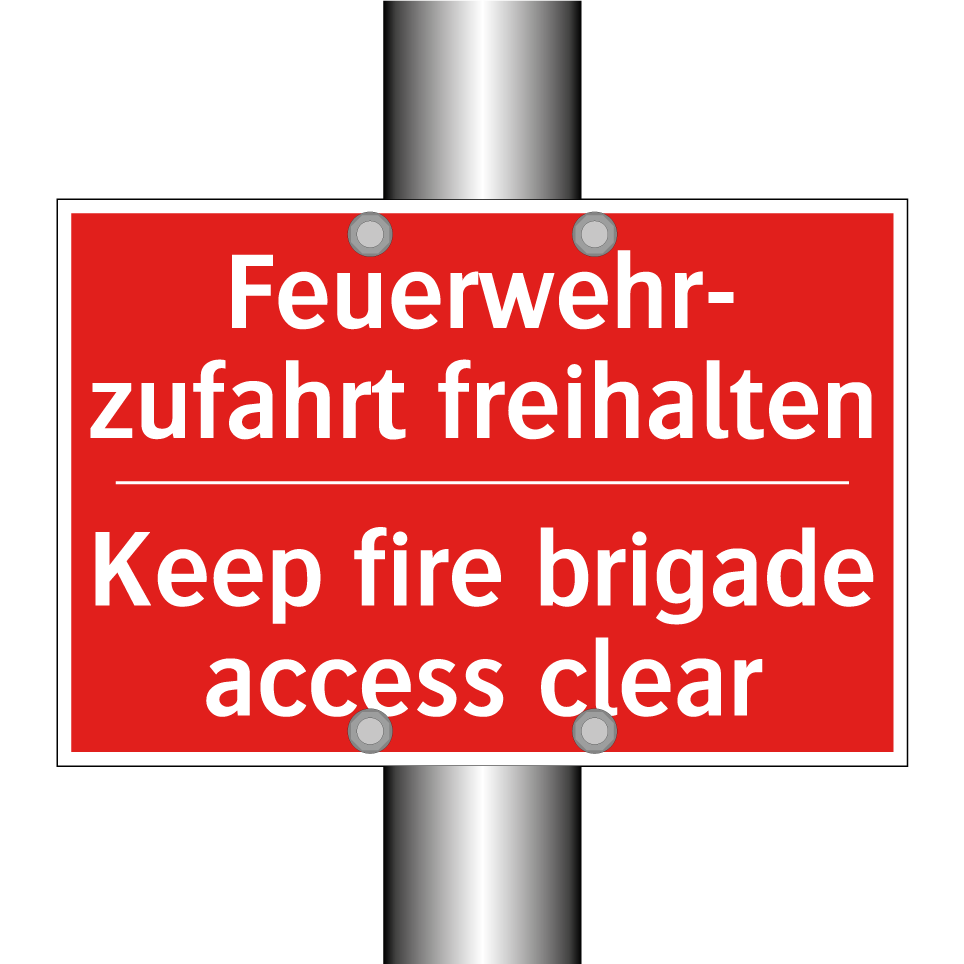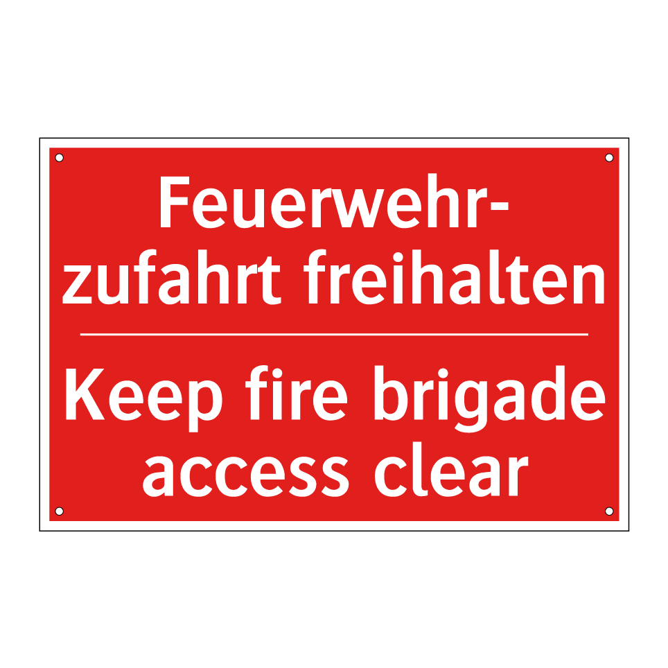 Zweisprachiges Brandschutzschild mit deutschem Text Feuerwehr- zufahrt freihalten und englischem Text Keep fire brigade access clear