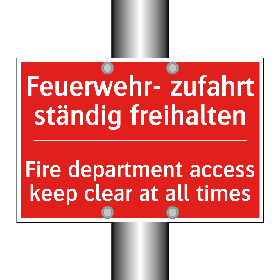 Zweisprachiges Brandschutzschild mit deutschem Text Feuerwehr- zufahrt ständig freihalten und englischem Text Fire department access keep clear at all times