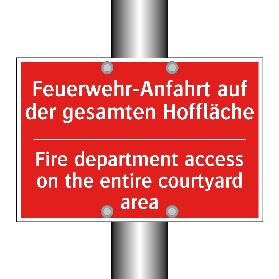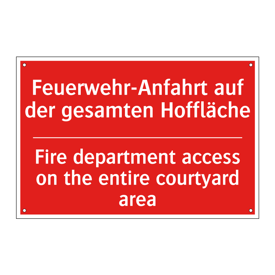 Zweisprachiges Brandschutzschild mit deutschem Text Feuerwehr-Anfahrt auf der gesamten Hoffläche und englischem Text Fire department access on the entire courtyard area
