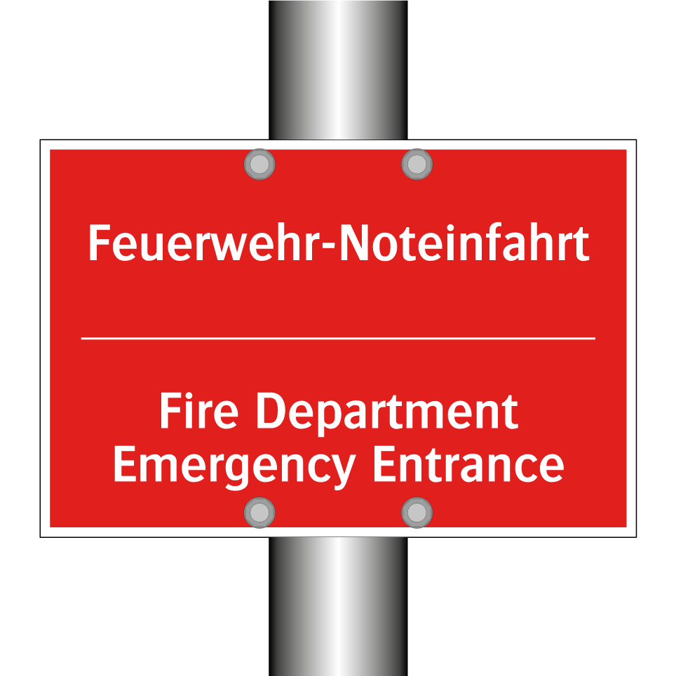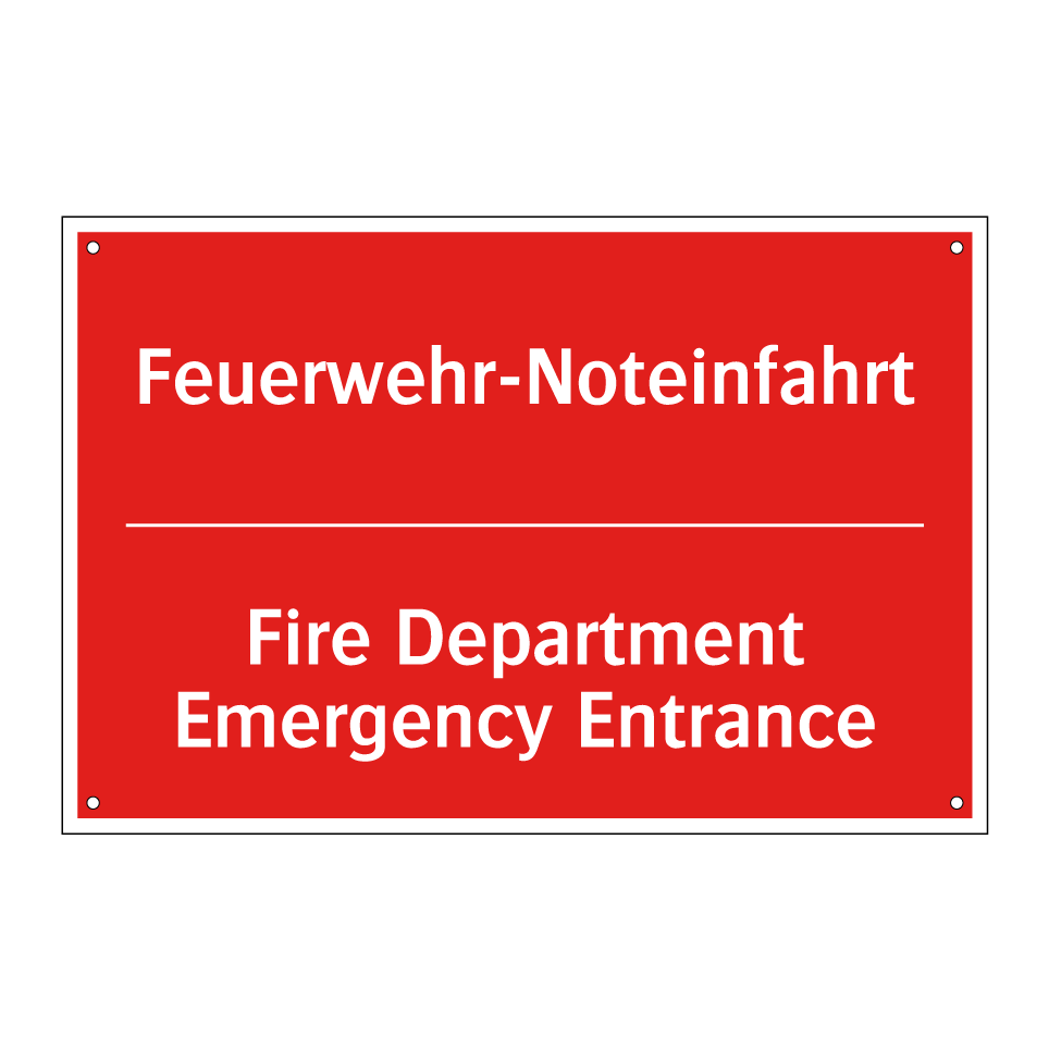 Zweisprachiges Brandschutzschild mit deutschem Text Feuerwehr-Noteinfahrt und englischem Text Fire Department Emergency Entrance