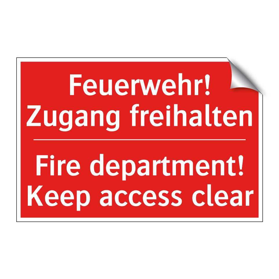 Zweisprachiges Brandschutzschild mit deutschem Text Feuerwehr! Zugang freihalten und englischem Text Fire department! Keep access clear