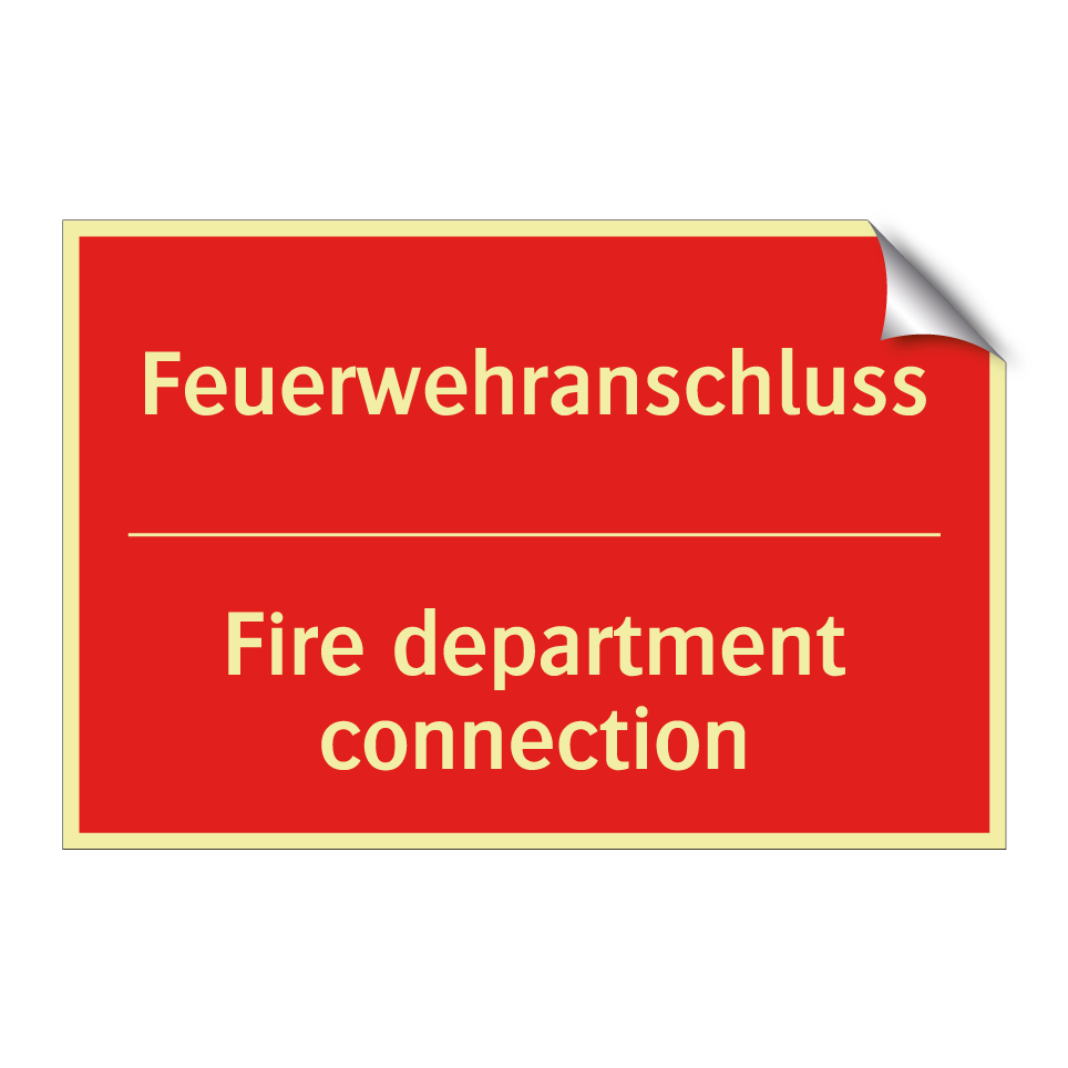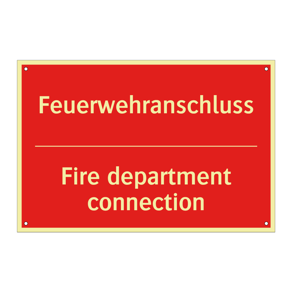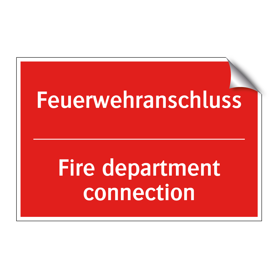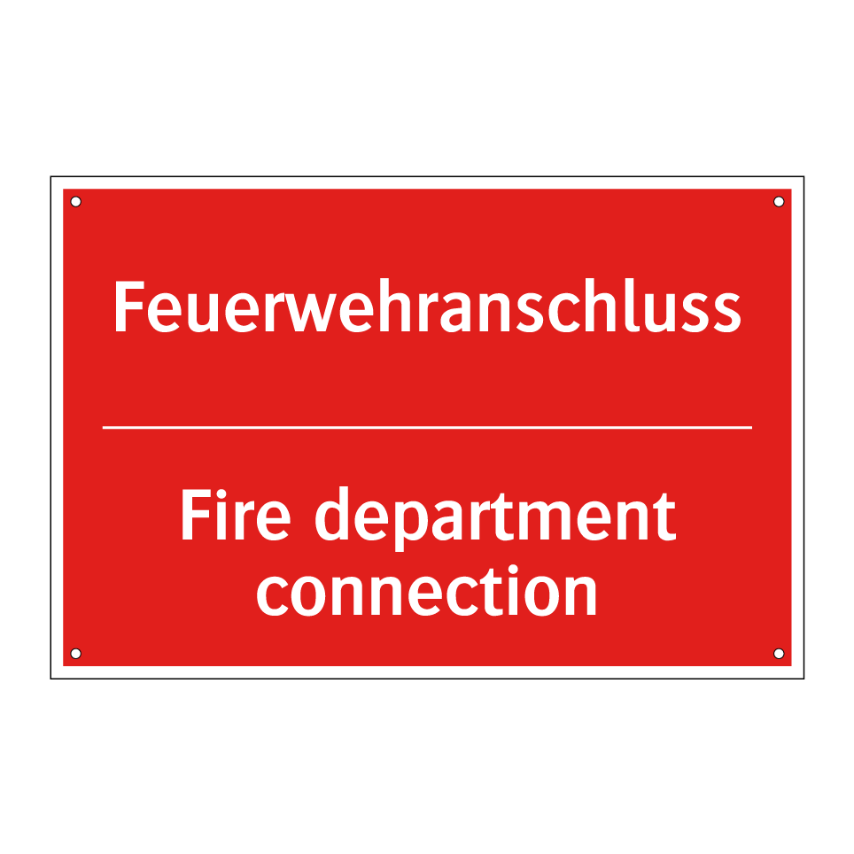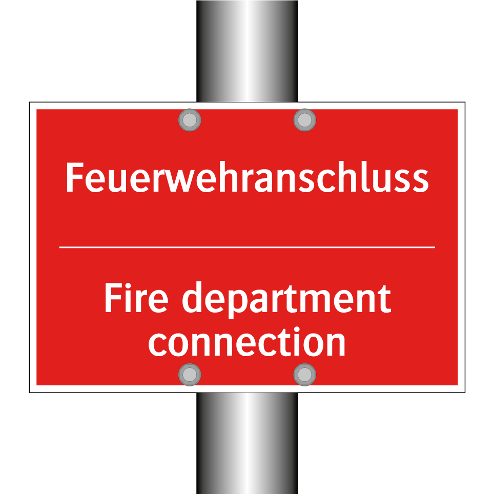 Zweisprachiges Brandschutzschild mit deutschem Text Feuerwehranschluss und englischem Text Fire department connection