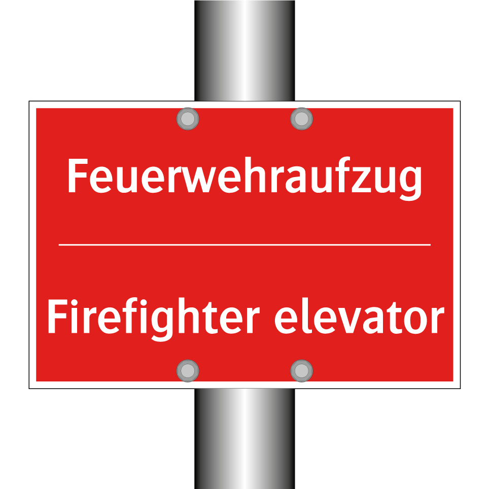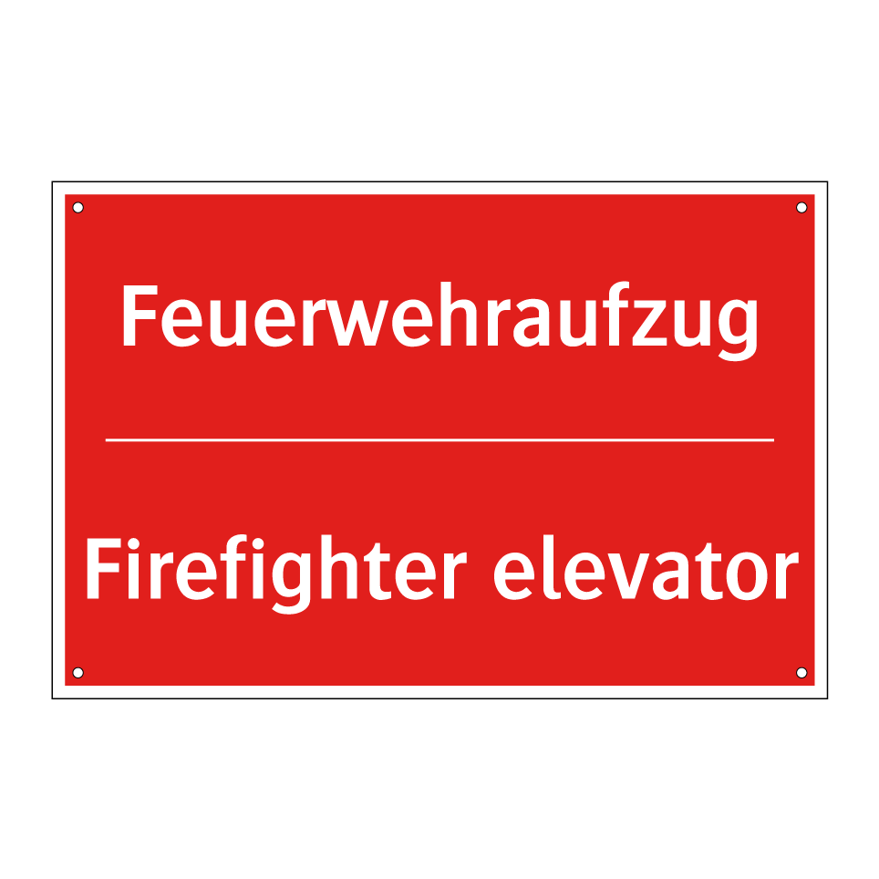 Zweisprachiges Brandschutzschild mit deutschem Text Feuerwehraufzug und englischem Text Firefighter elevator