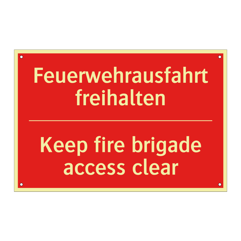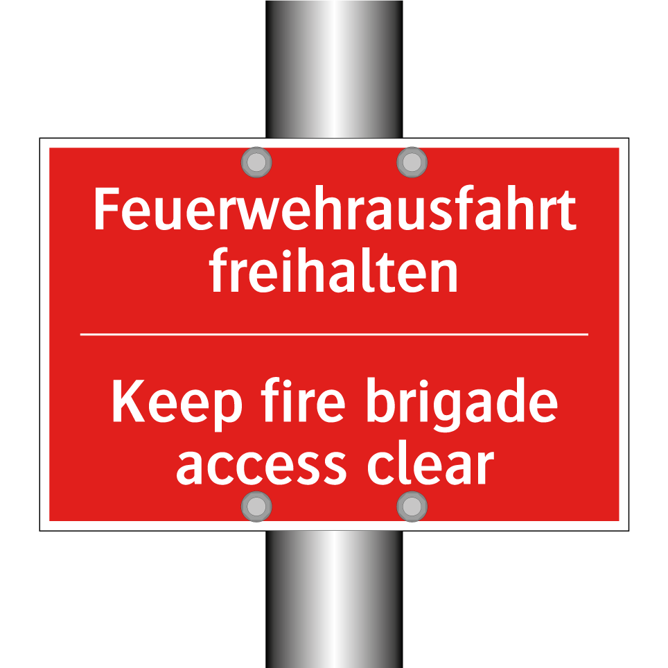 Zweisprachiges Brandschutzschild mit deutschem Text Feuerwehrausfahrt freihalten und englischem Text Keep fire brigade access clear
