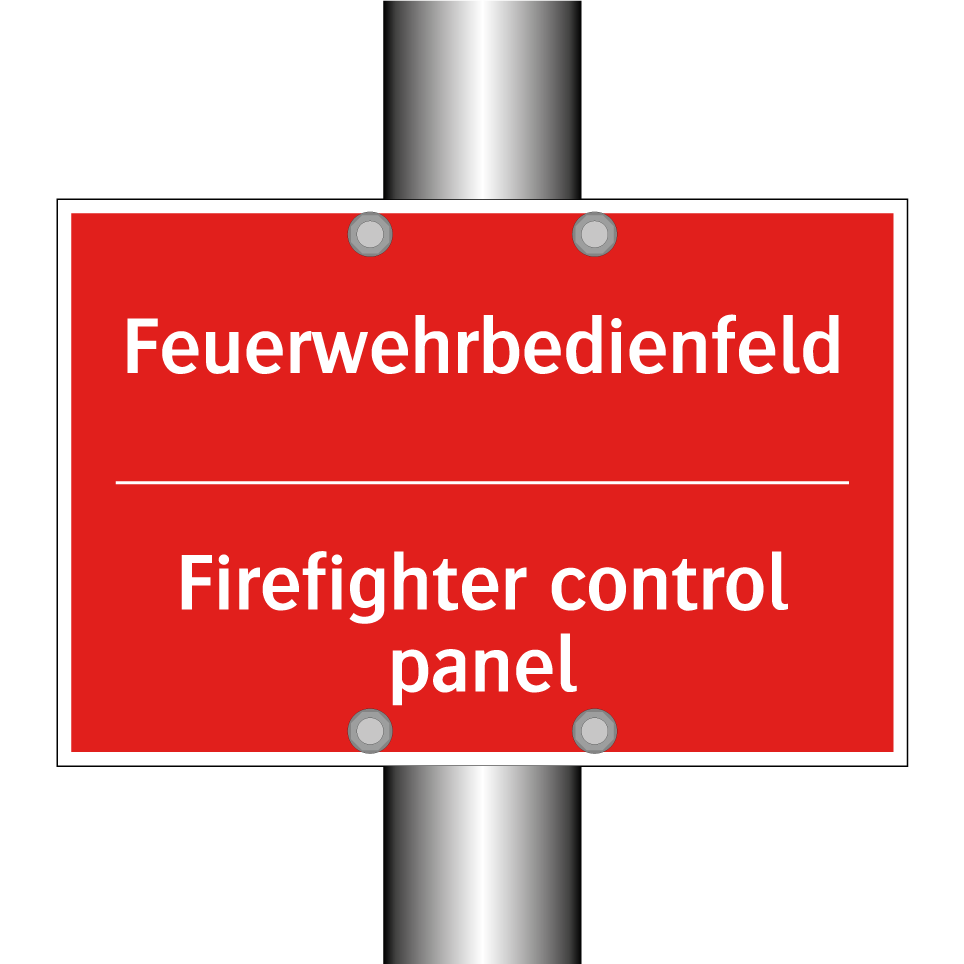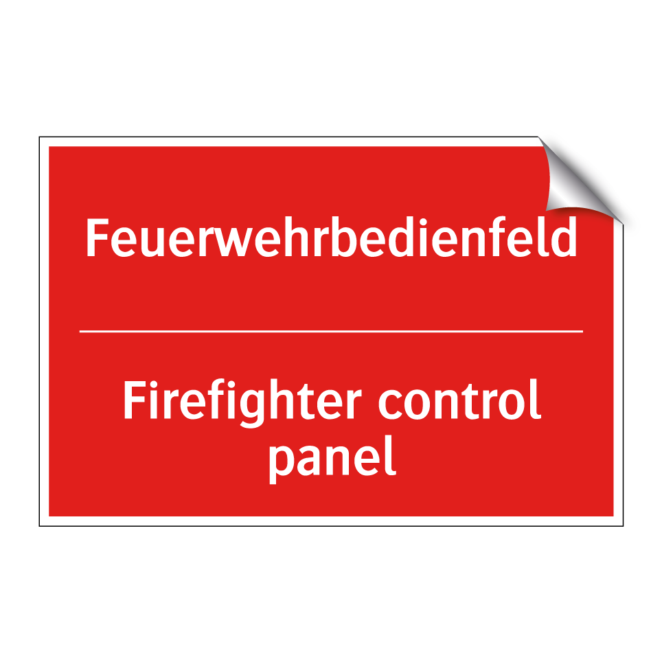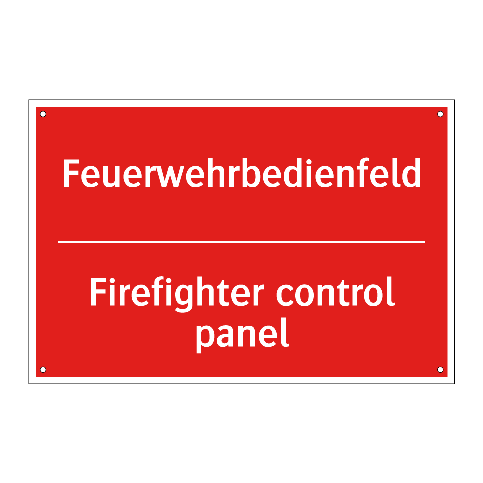 Zweisprachiges Brandschutzschild mit deutschem Text Feuerwehrbedienfeld und englischem Text Firefighter control panel