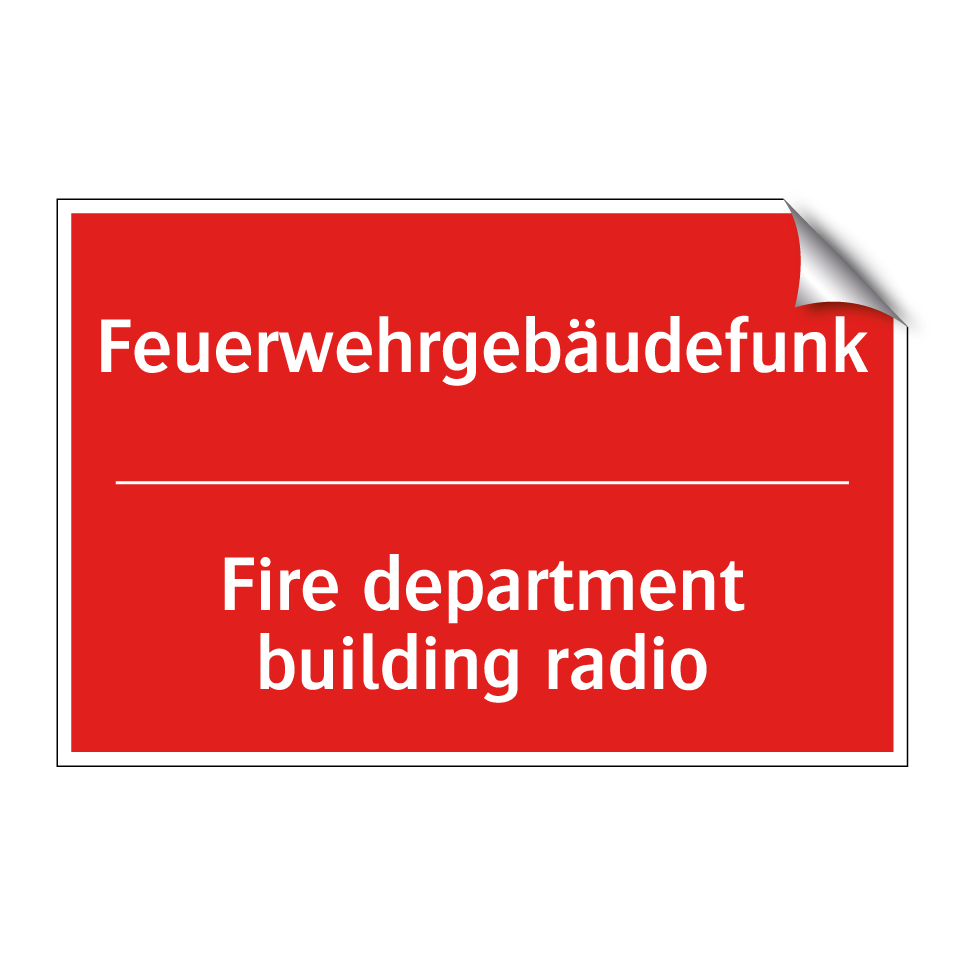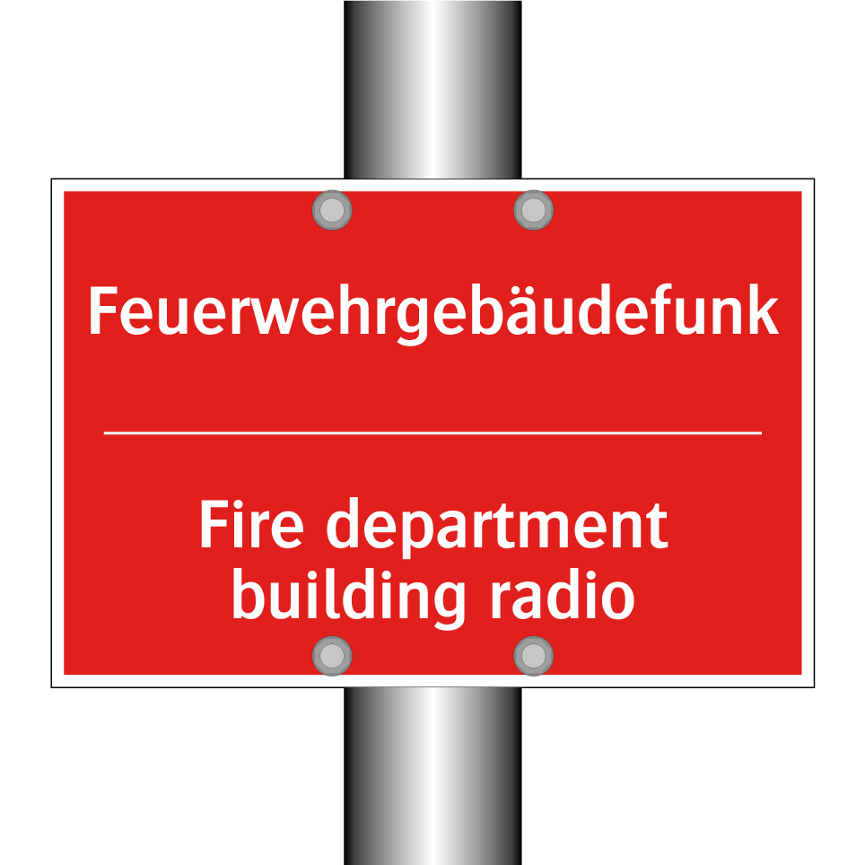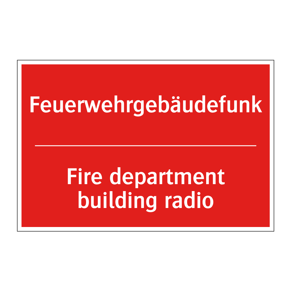 Zweisprachiges Brandschutzschild mit deutschem Text Feuerwehrgebäudefunk und englischem Text Fire department building radio