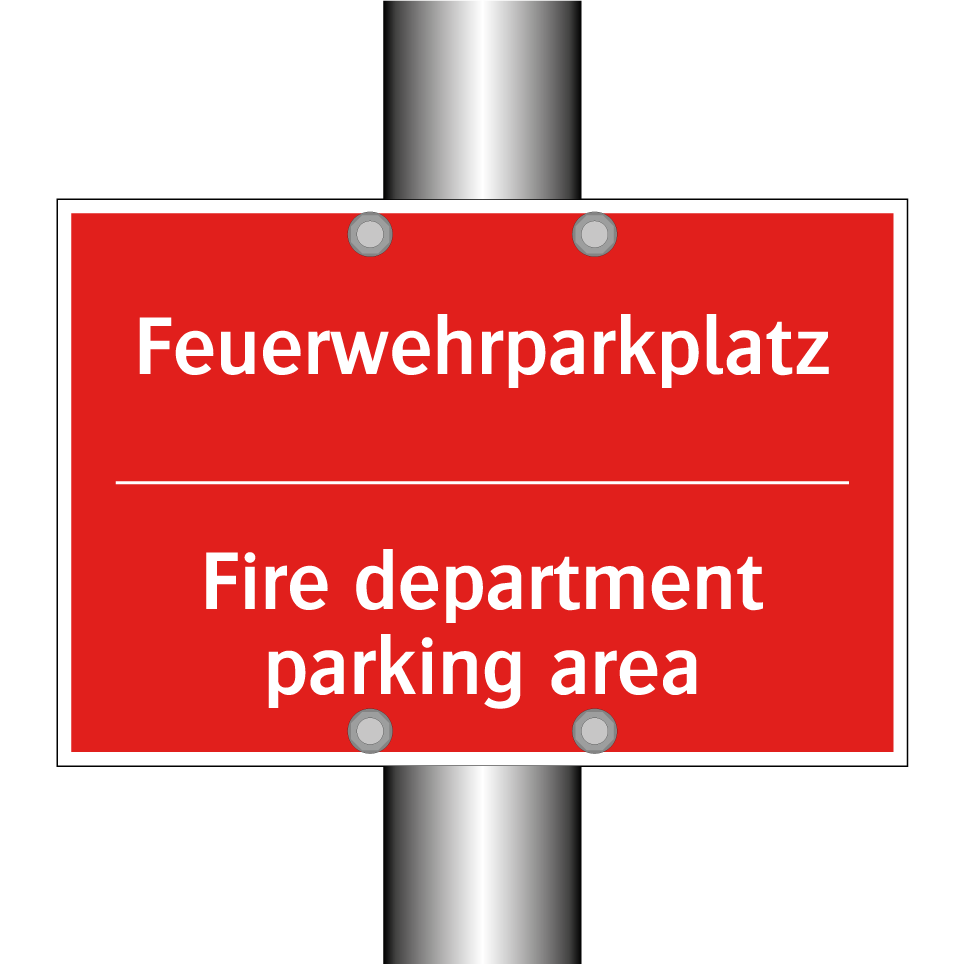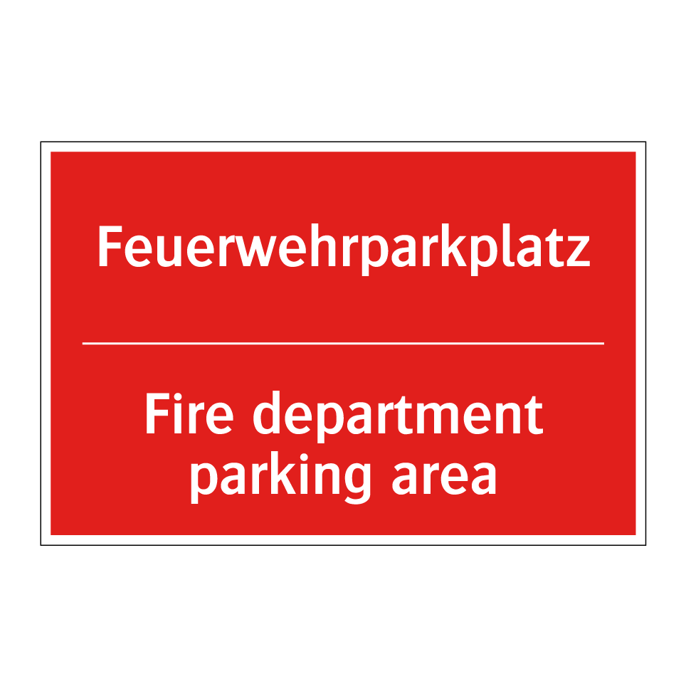 Zweisprachiges Brandschutzschild mit deutschem Text Feuerwehrparkplatz und englischem Text Fire department parking area