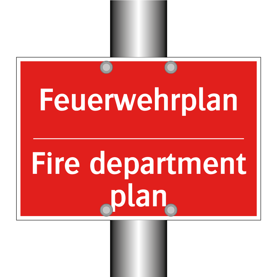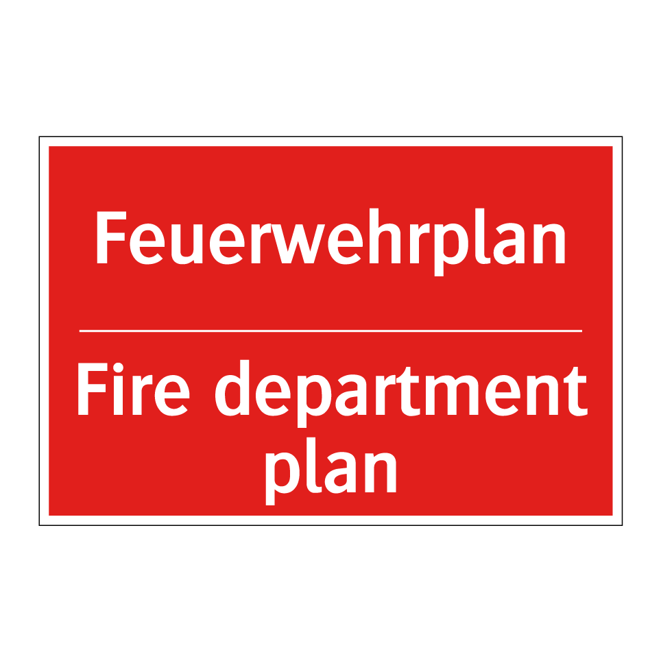Zweisprachiges Brandschutzschild mit deutschem Text Feuerwehrplan und englischem Text Fire department plan
