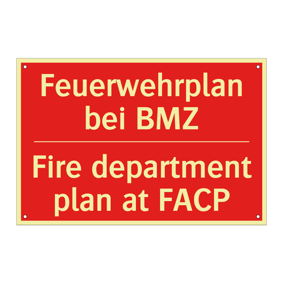 Zweisprachiges Brandschutzschild mit deutschem Text Feuerwehrplan bei BMZ und englischem Text Fire department plan at FACP