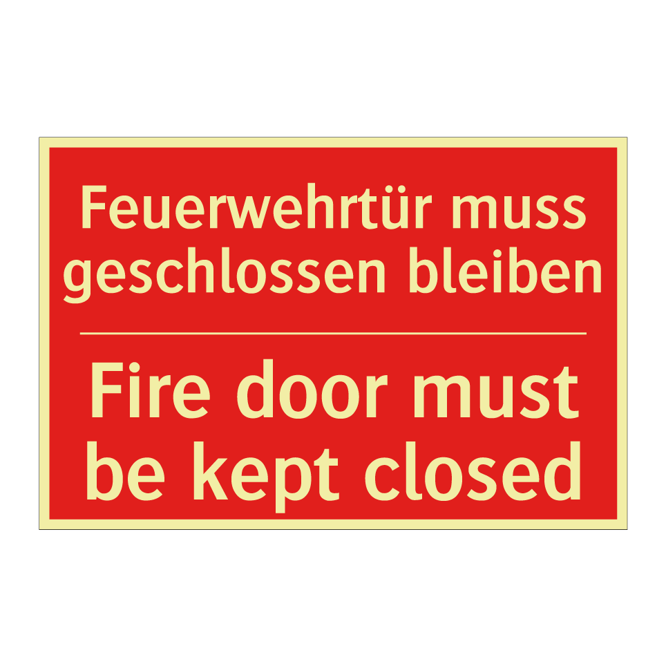 Zweisprachiges Brandschutzschild mit deutschem Text Feuerwehrtür muss geschlossen bleiben und englischem Text Fire door must be kept closed