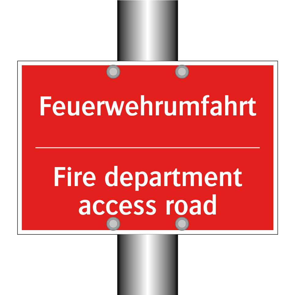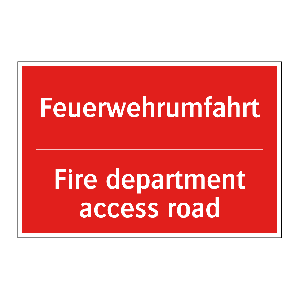 Zweisprachiges Brandschutzschild mit deutschem Text Feuerwehrumfahrt und englischem Text Fire department access road