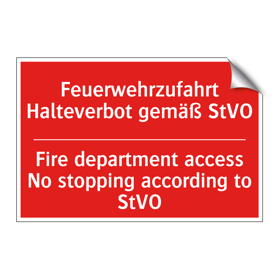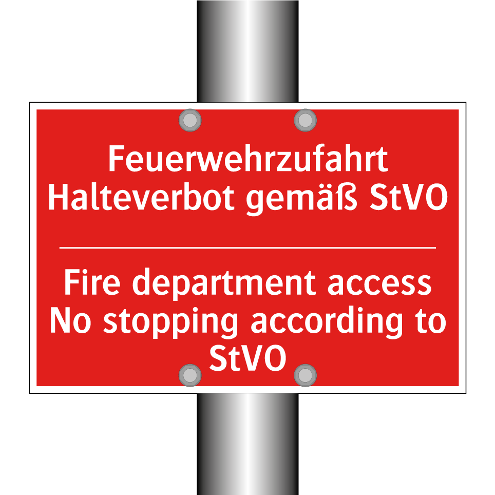 Zweisprachiges Brandschutzschild mit deutschem Text Feuerwehrzufahrt Halteverbot gemäß StVO und englischem Text Fire department access No stopping according to StVO