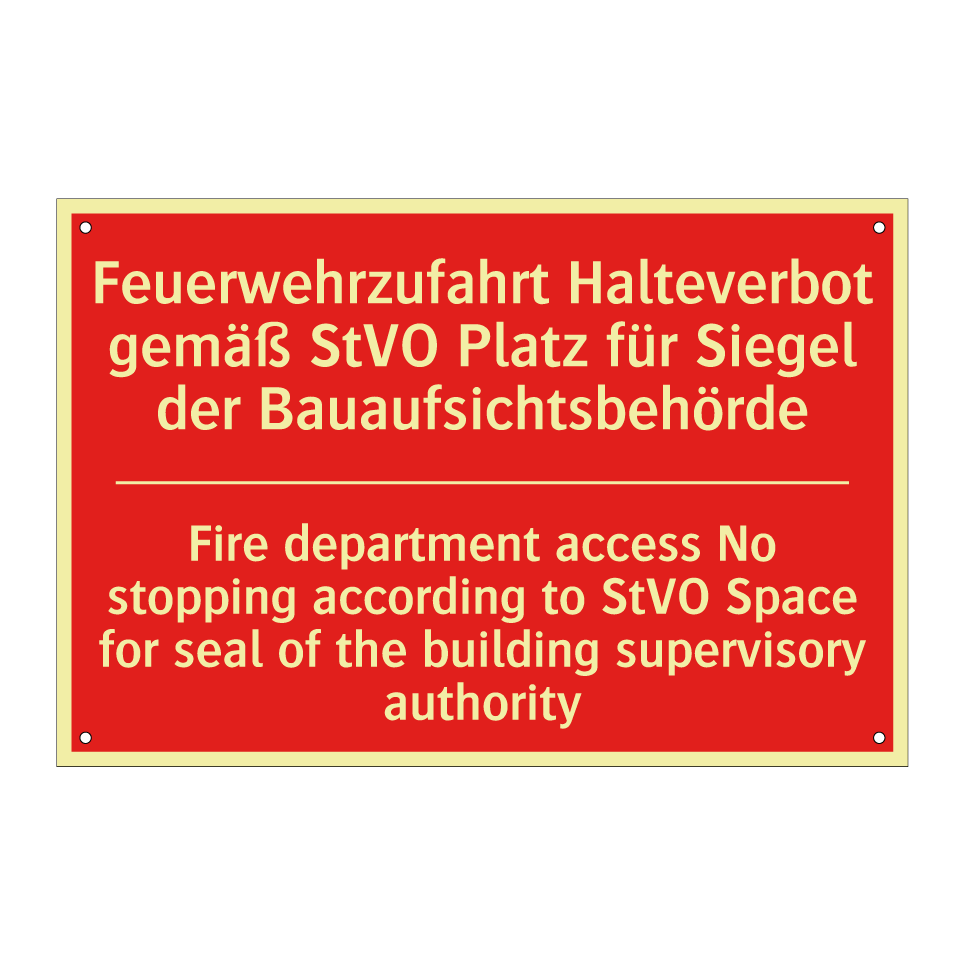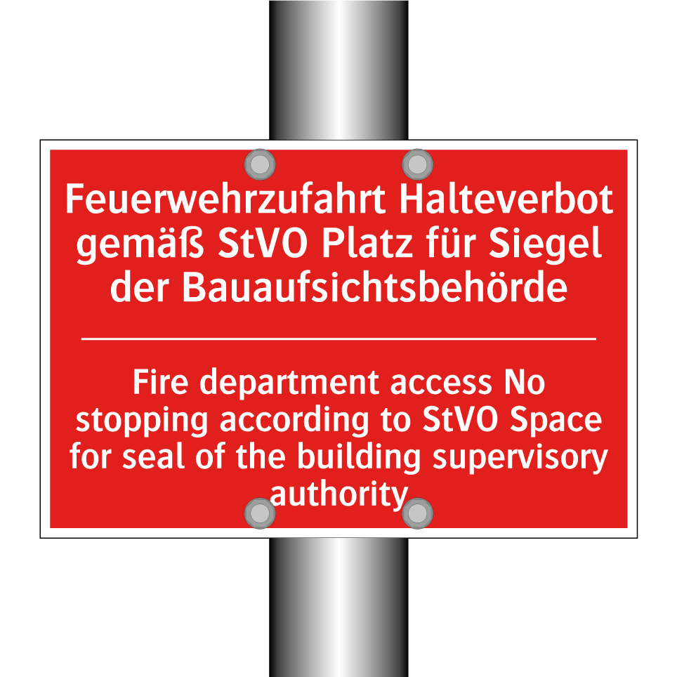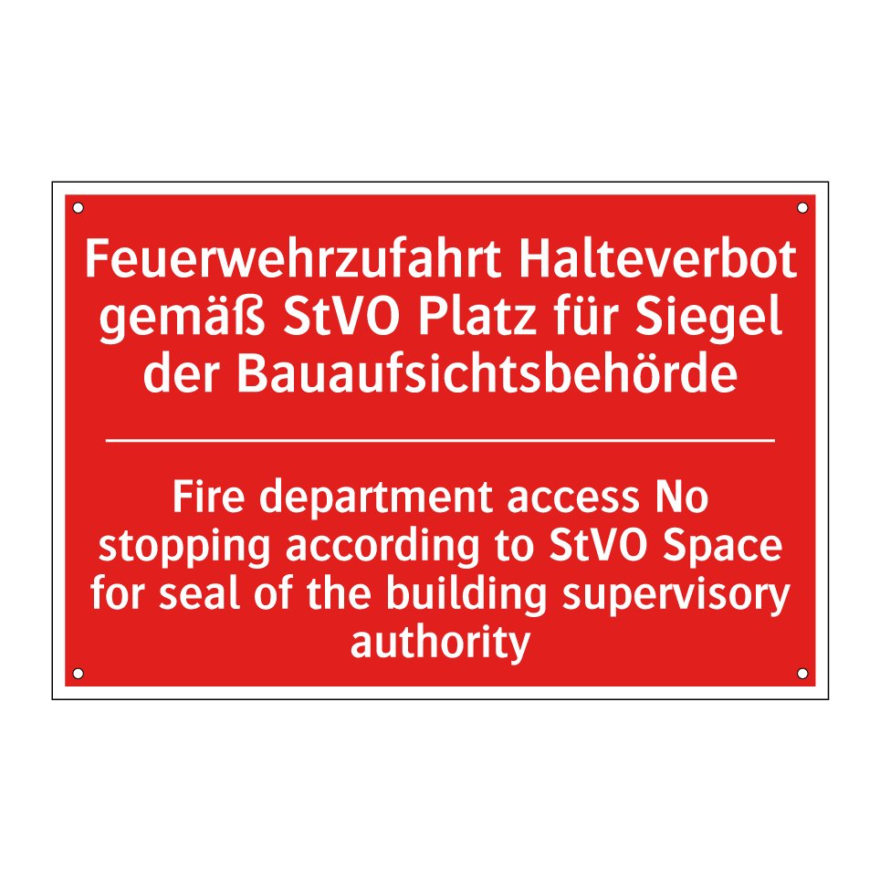Zweisprachiges Brandschutzschild mit deutschem Text Feuerwehrzufahrt Halteverbot gemäß StVO Platz für Siegel der Bauaufsichtsbehörde und englischem Text Fire department access No stopping according to StVO Space for seal of the building supervisory authority