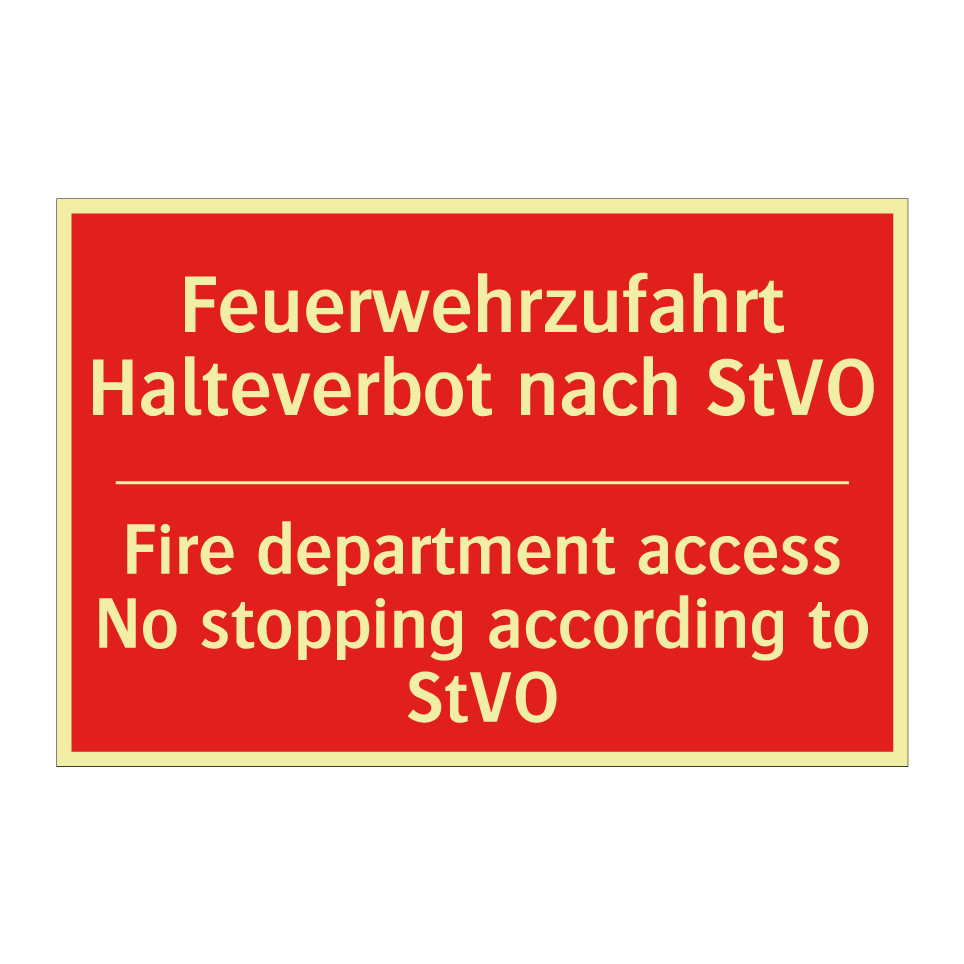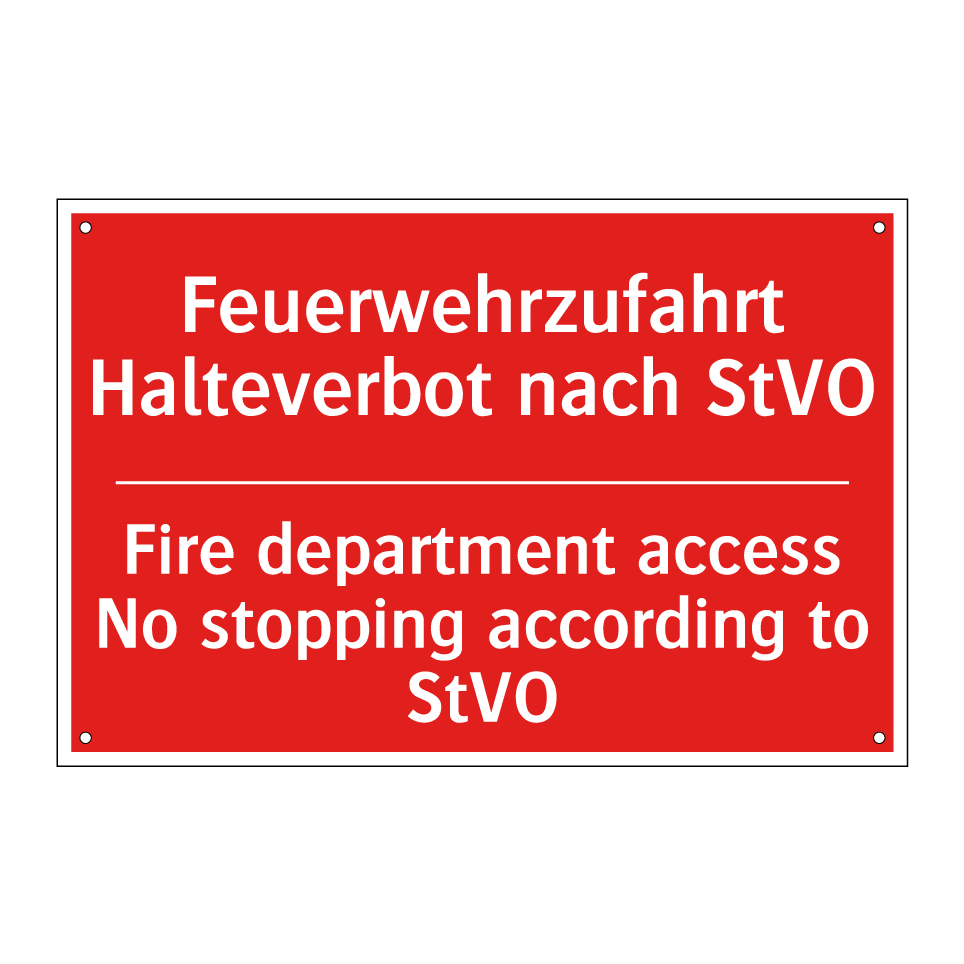 Zweisprachiges Brandschutzschild mit deutschem Text Feuerwehrzufahrt Halteverbot nach StVO und englischem Text Fire department access No stopping according to StVO