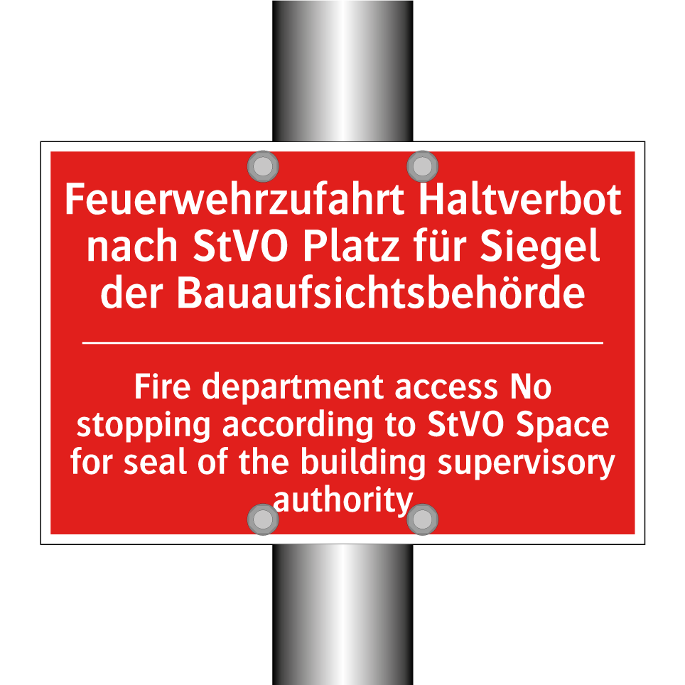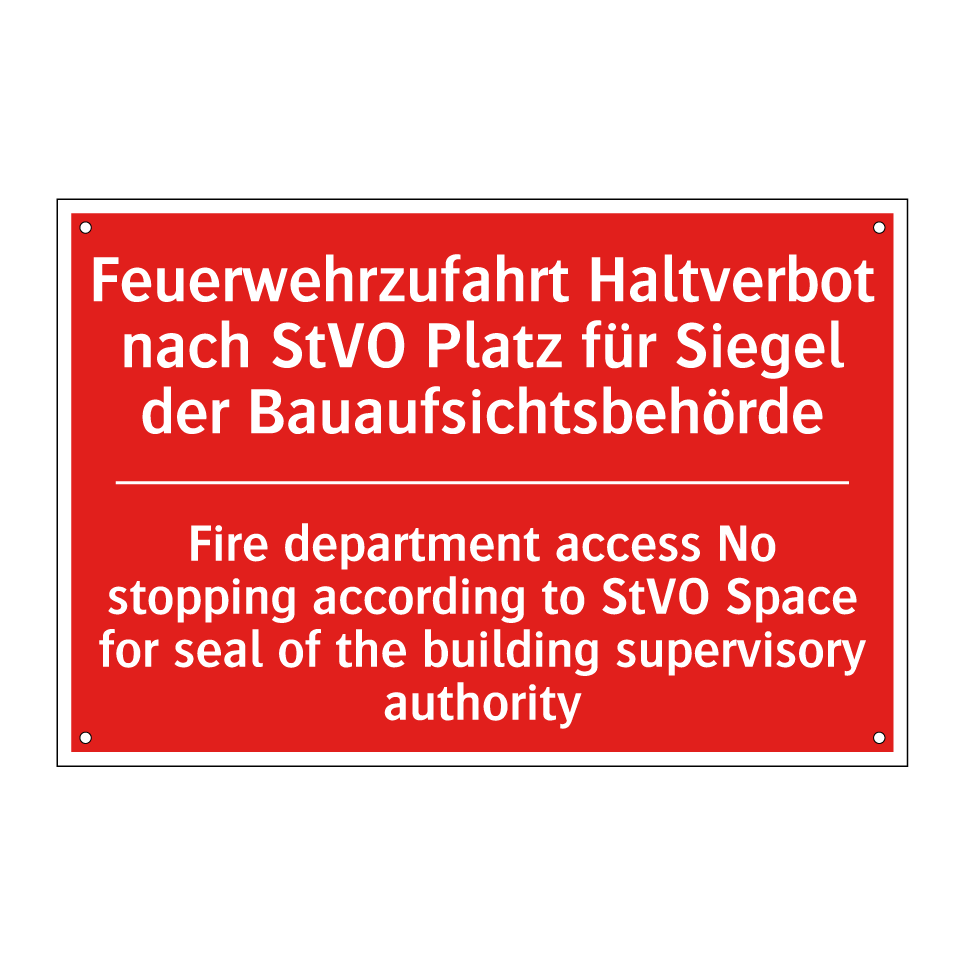 Zweisprachiges Brandschutzschild mit deutschem Text Feuerwehrzufahrt Haltverbot nach StVO Platz für Siegel der Bauaufsichtsbehörde und englischem Text Fire department access No stopping according to StVO Space for seal of the building supervisory authority