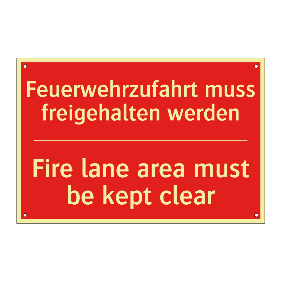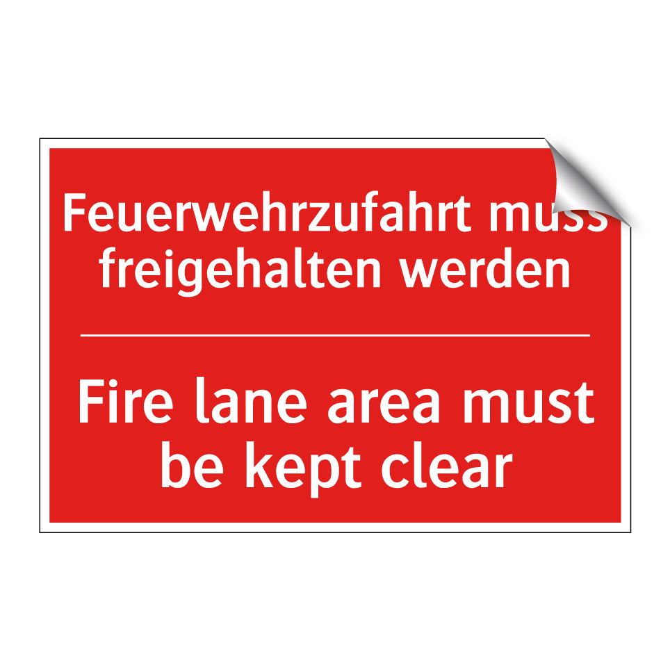 Zweisprachiges Brandschutzschild mit deutschem Text Feuerwehrzufahrt muss freigehalten werden und englischem Text Fire lane area must be kept clear