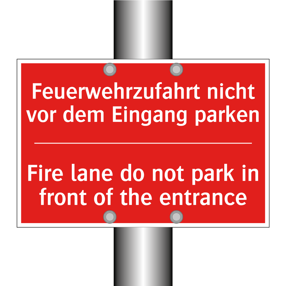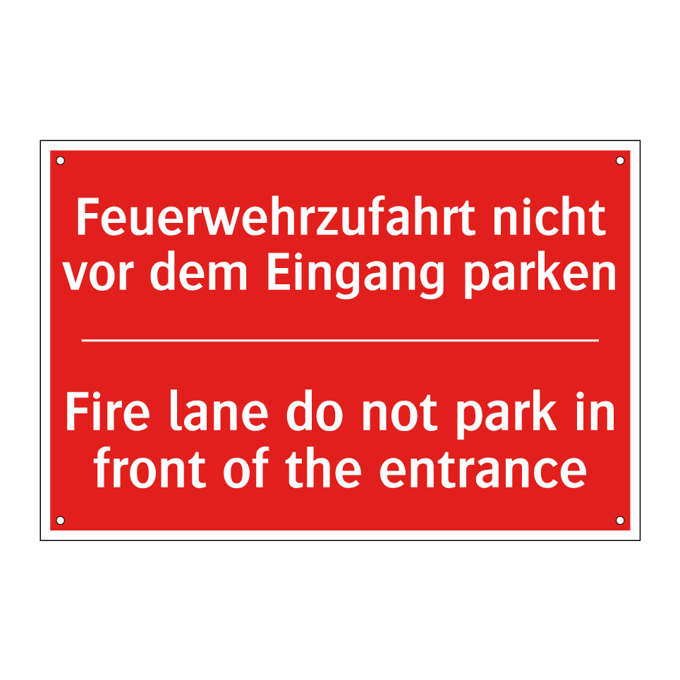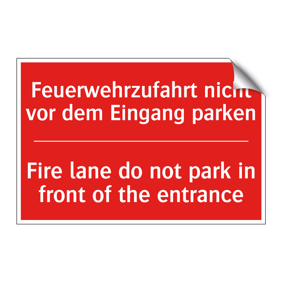 Zweisprachiges Brandschutzschild mit deutschem Text Feuerwehrzufahrt nicht vor dem Eingang parken und englischem Text Fire lane do not park in front of the entrance