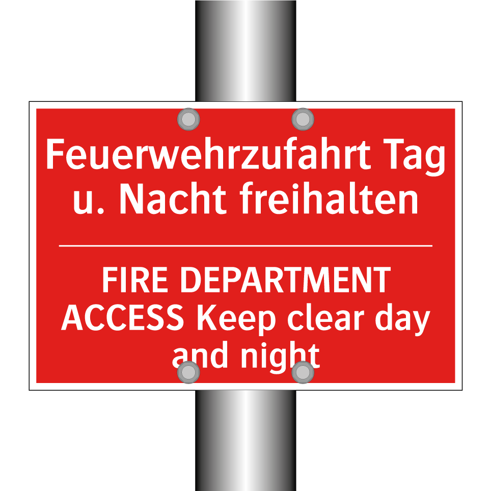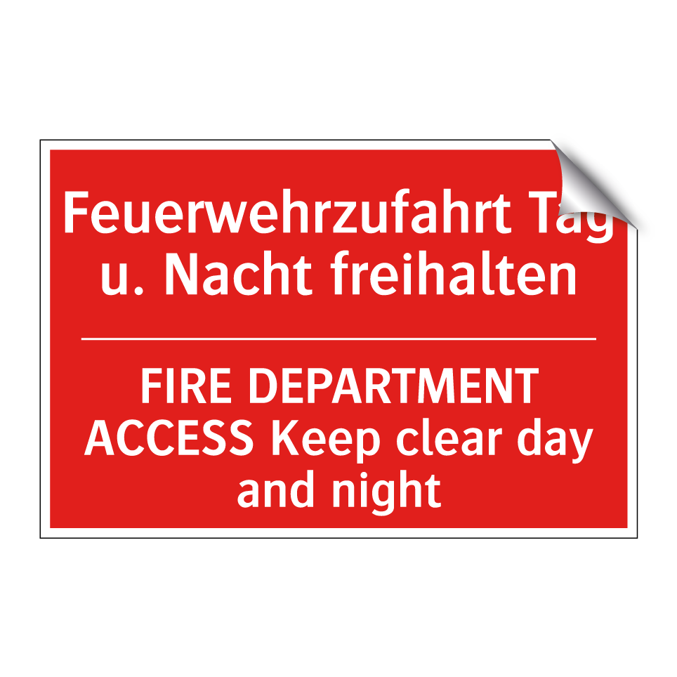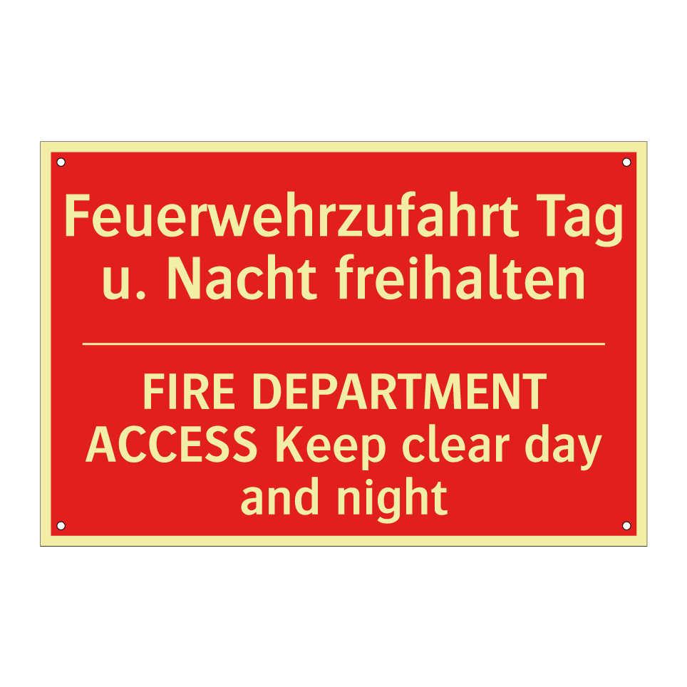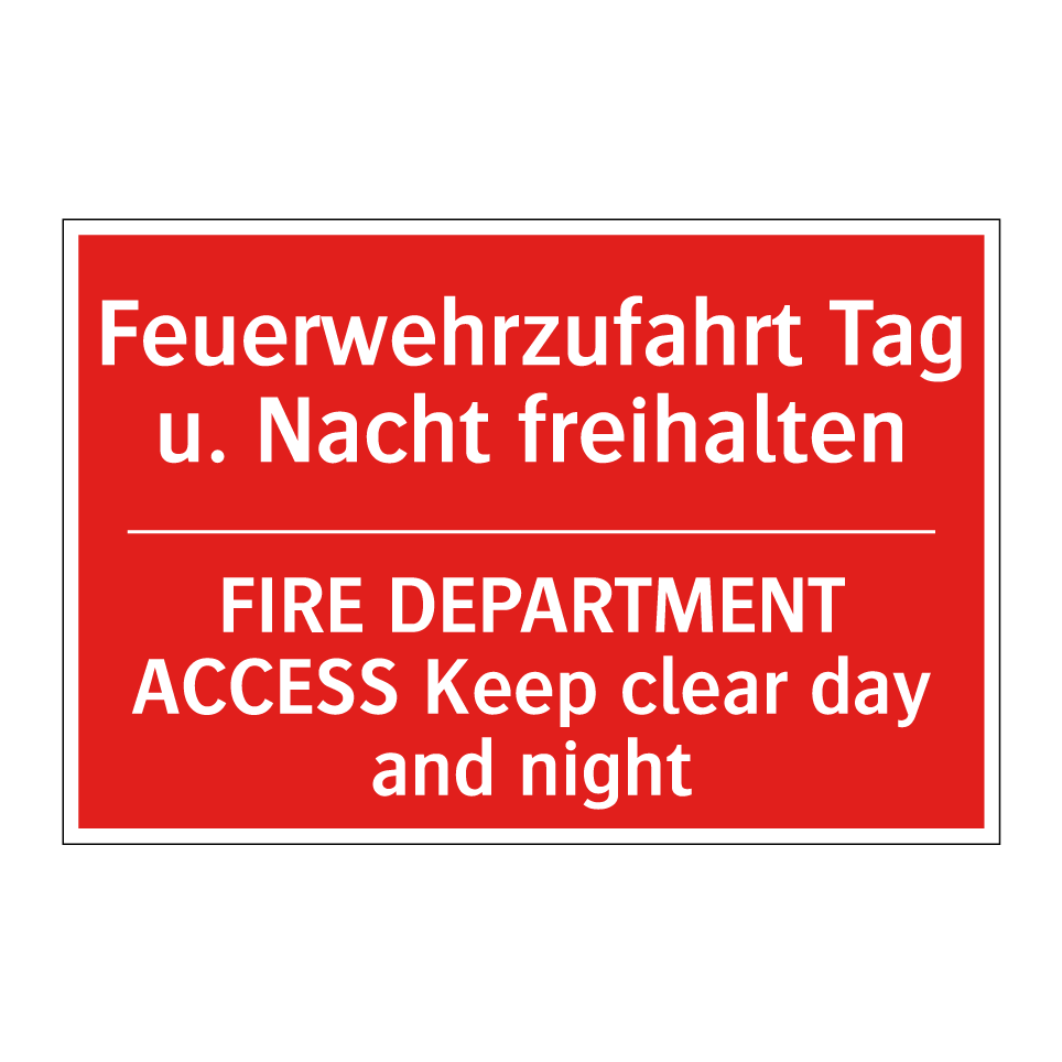 Zweisprachiges Brandschutzschild mit deutschem Text Feuerwehrzufahrt Tag u. Nacht freihalten und englischem Text FIRE DEPARTMENT ACCESS Keep clear day and night