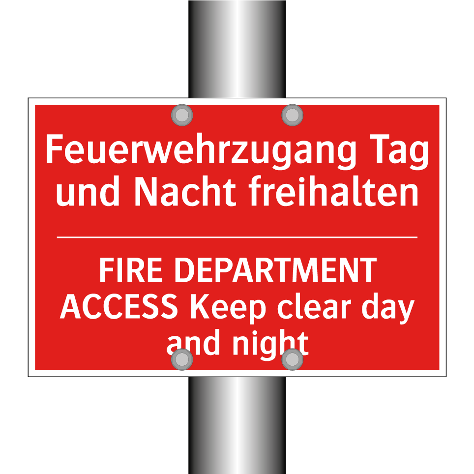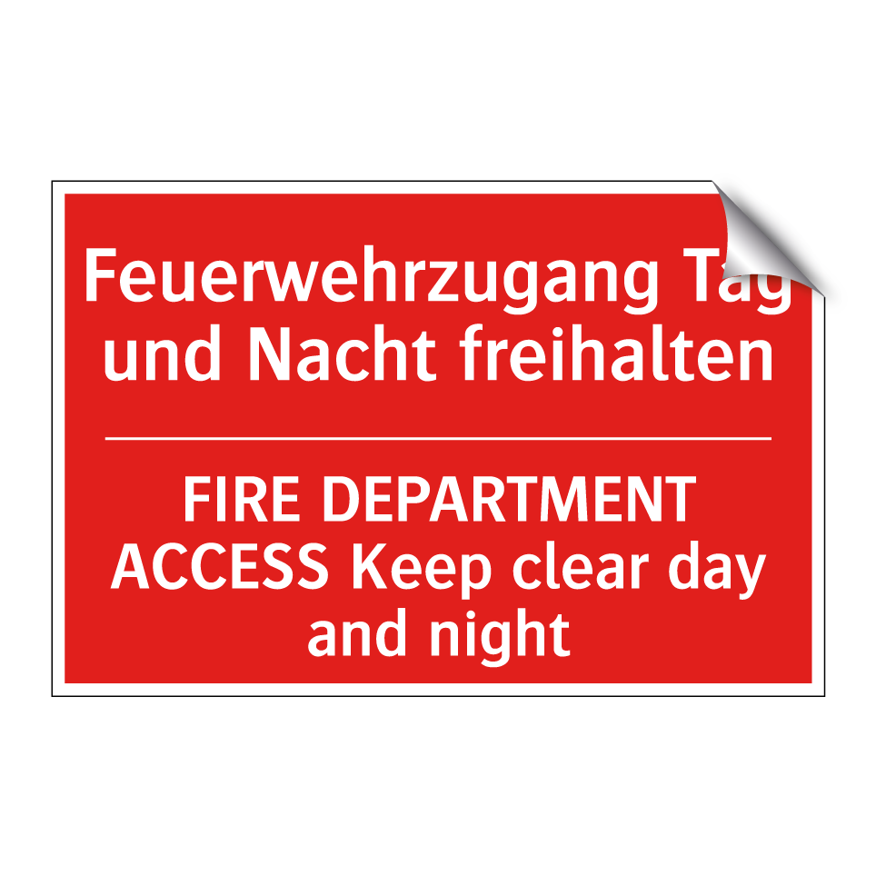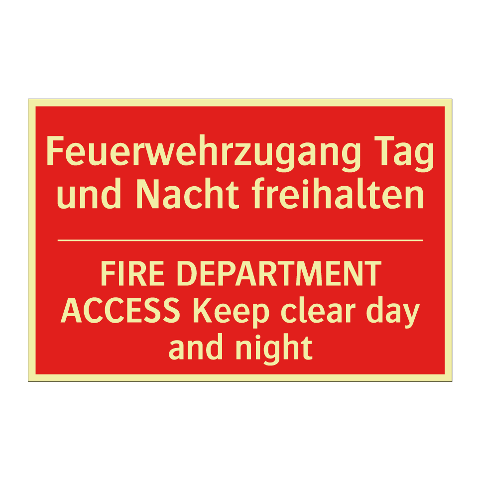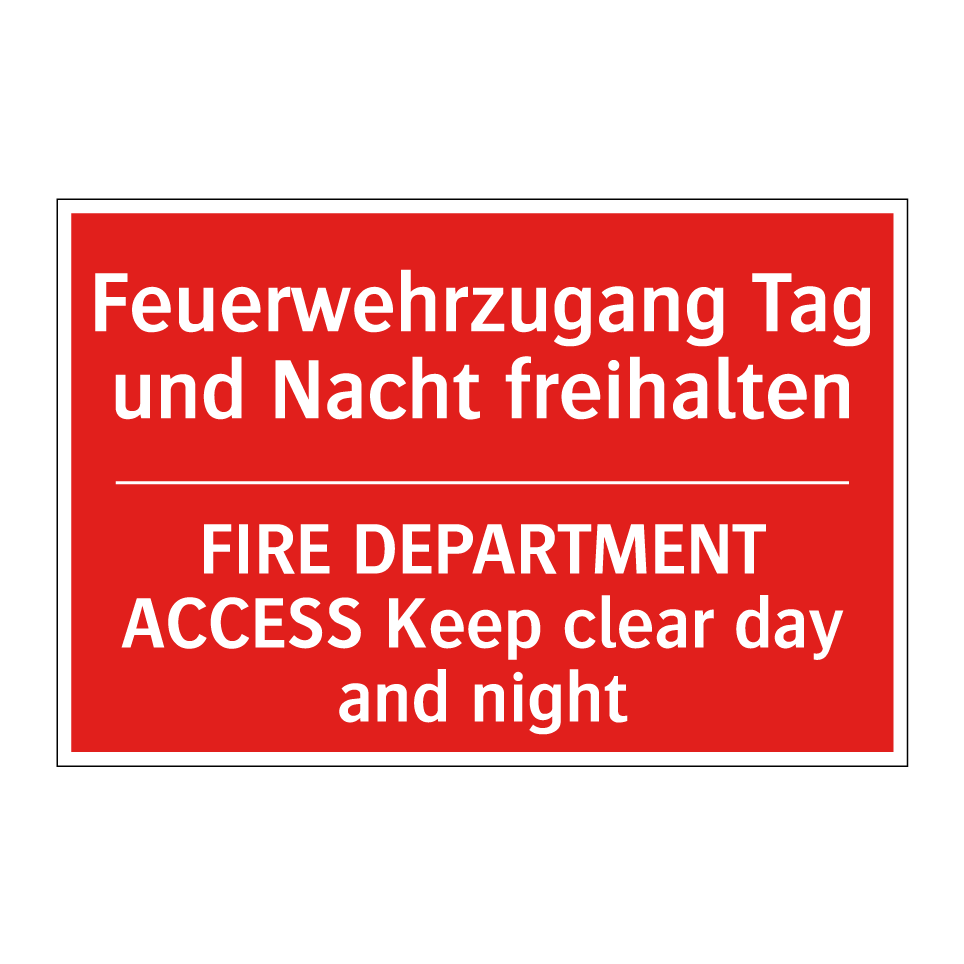 Zweisprachiges Brandschutzschild mit deutschem Text Feuerwehrzugang Tag und Nacht freihalten und englischem Text FIRE DEPARTMENT ACCESS Keep clear day and night