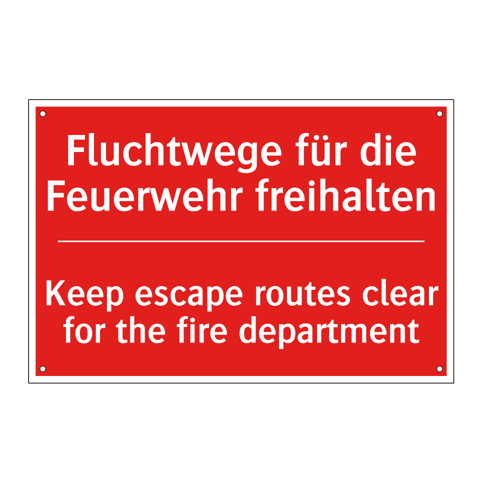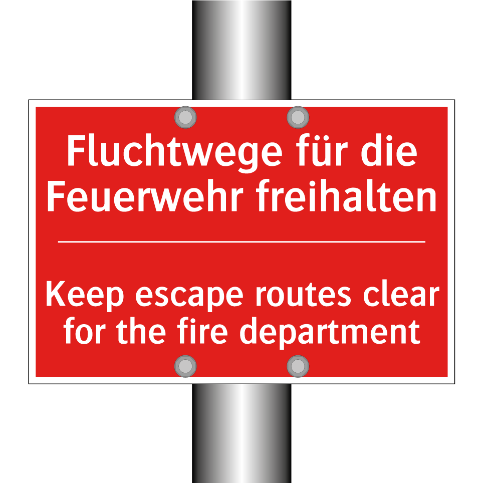 Zweisprachiges Brandschutzschild mit deutschem Text Fluchtwege für die Feuerwehr freihalten und englischem Text Keep escape routes clear for the fire department