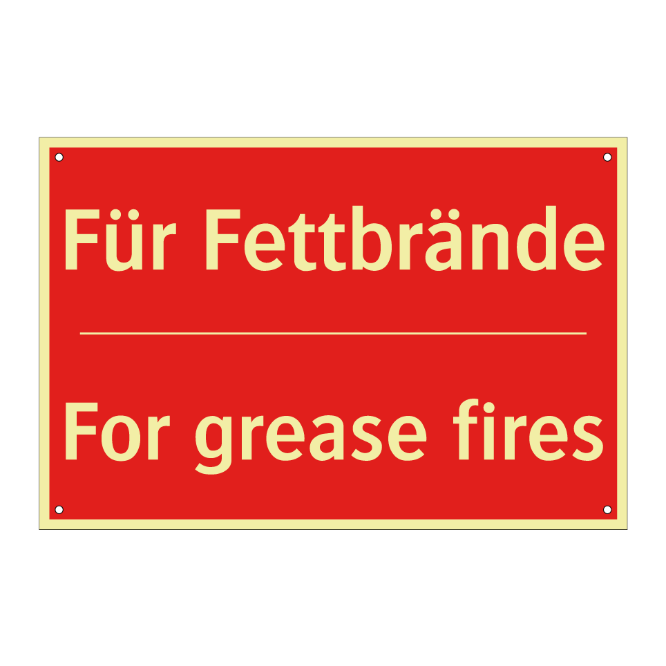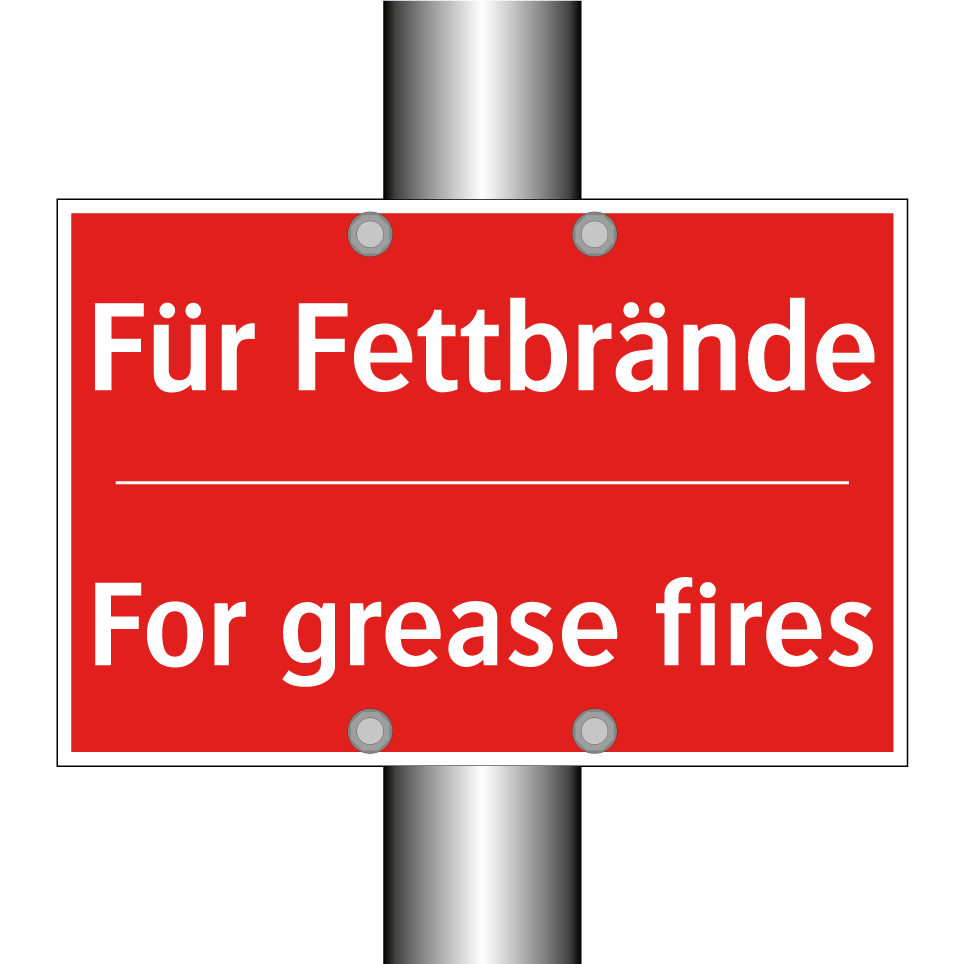 Zweisprachiges Brandschutzschild mit deutschem Text Für Fettbrände und englischem Text For grease fires