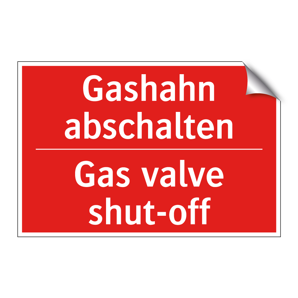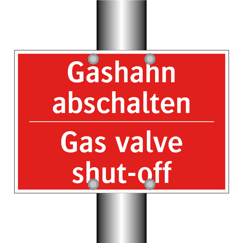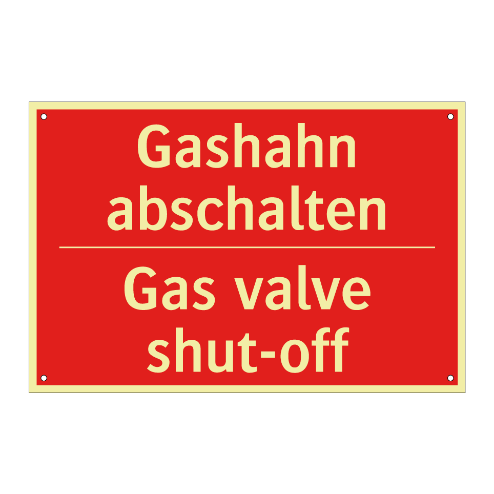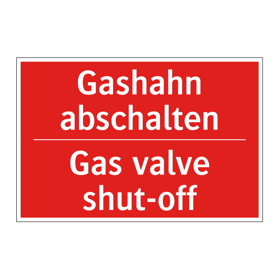 Zweisprachiges Brandschutzschild mit deutschem Text Gashahn abschalten und englischem Text Gas valve shut-off