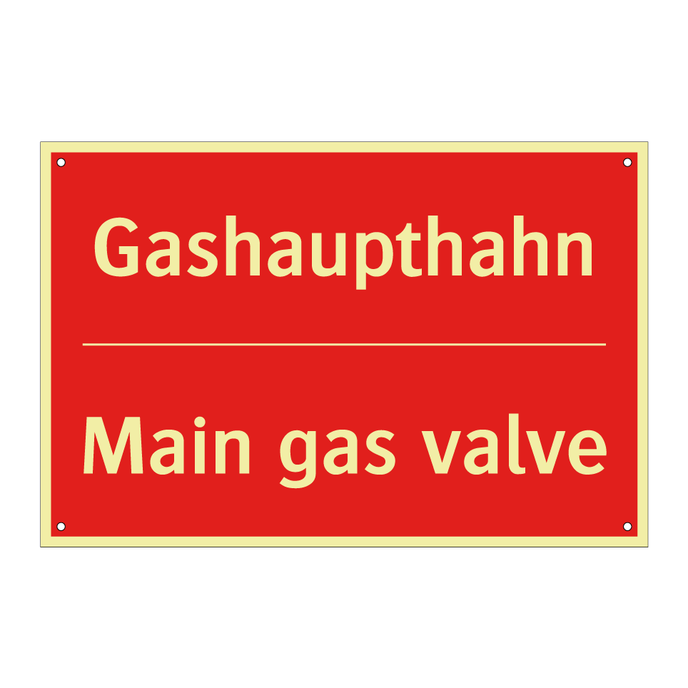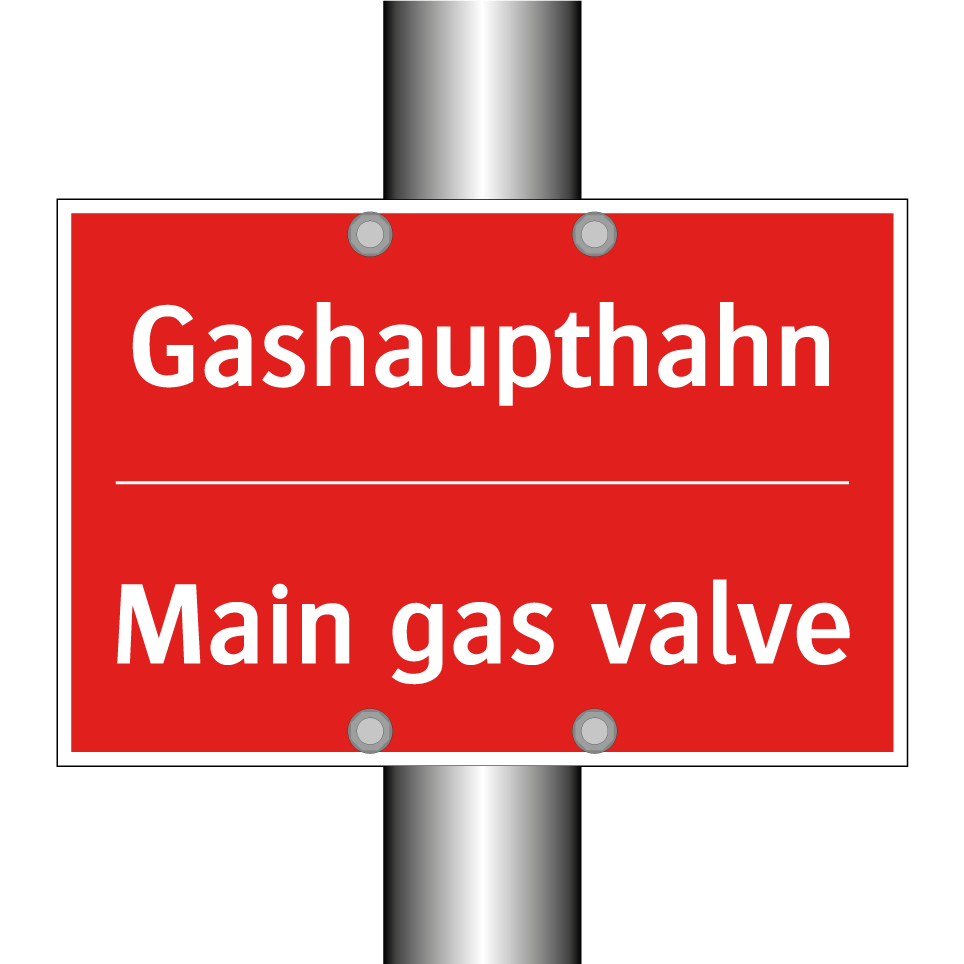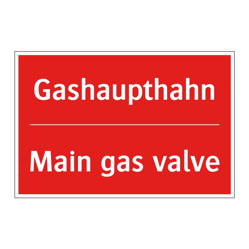 Zweisprachiges Brandschutzschild mit deutschem Text Gashaupthahn und englischem Text Main gas valve