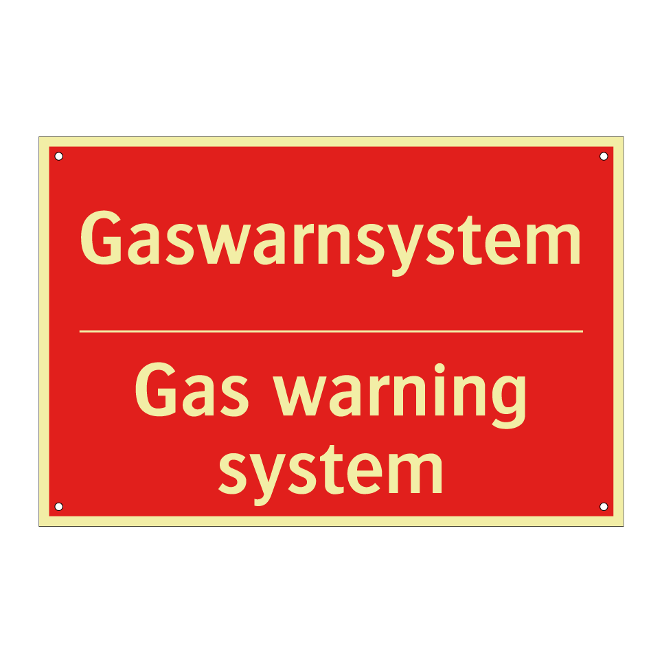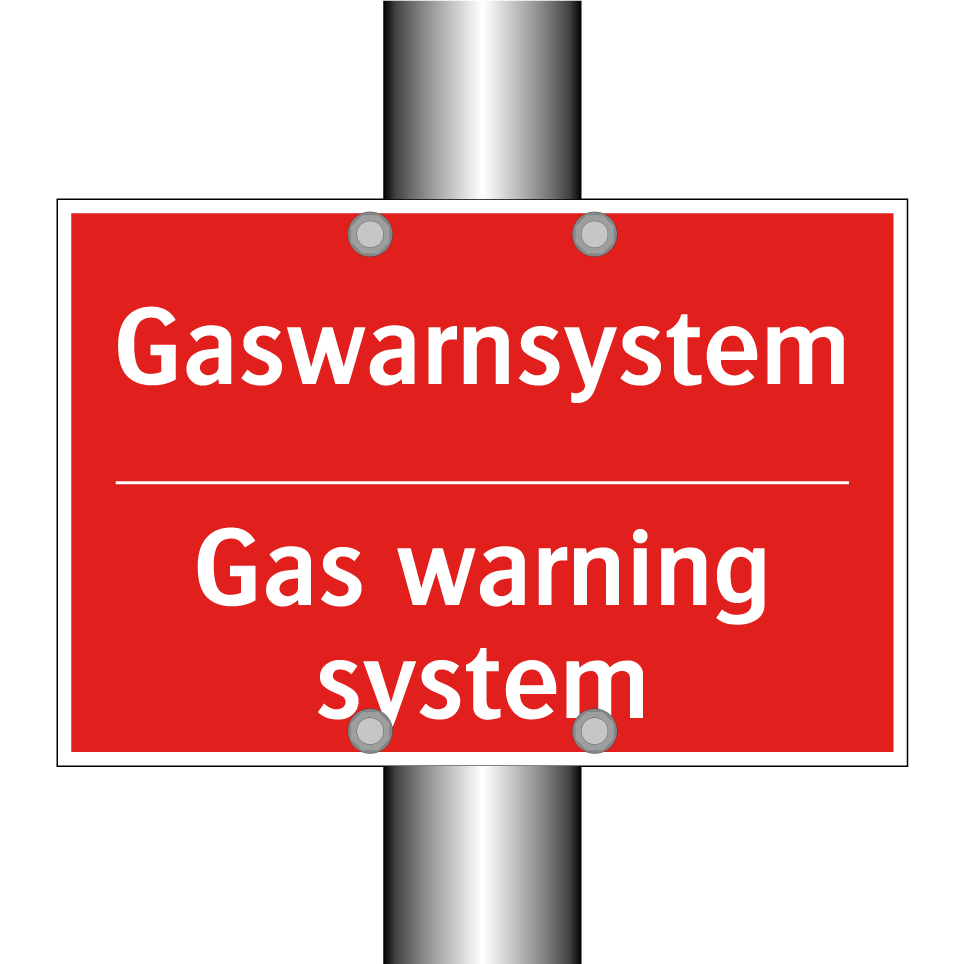 Zweisprachiges Brandschutzschild mit deutschem Text Gaswarnsystem und englischem Text Gas warning system
