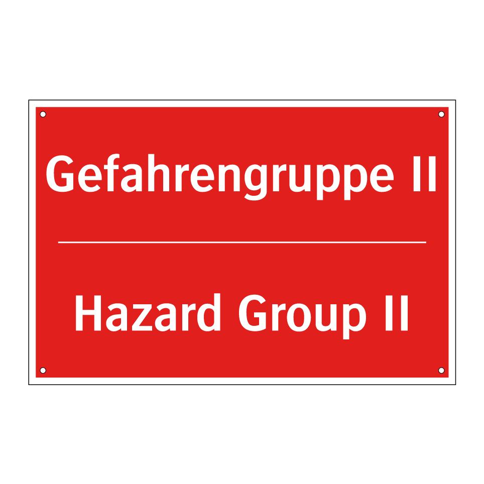 Zweisprachiges Brandschutzschild mit deutschem Text Gefahrengruppe II und englischem Text Hazard Group II