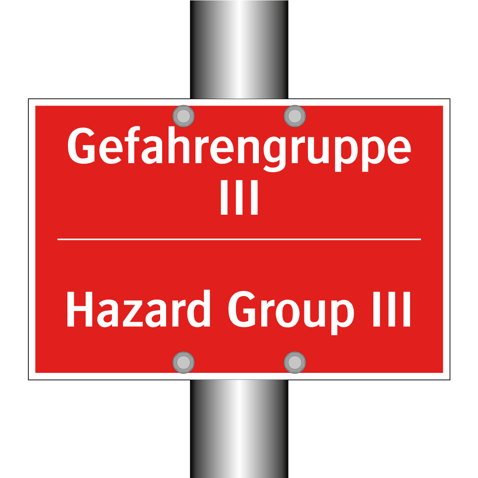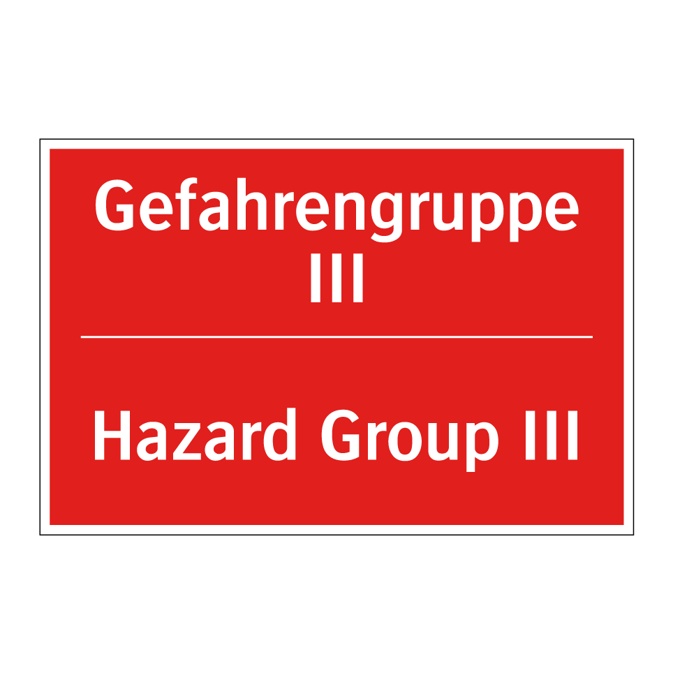Zweisprachiges Brandschutzschild mit deutschem Text Gefahrengruppe III und englischem Text Hazard Group III