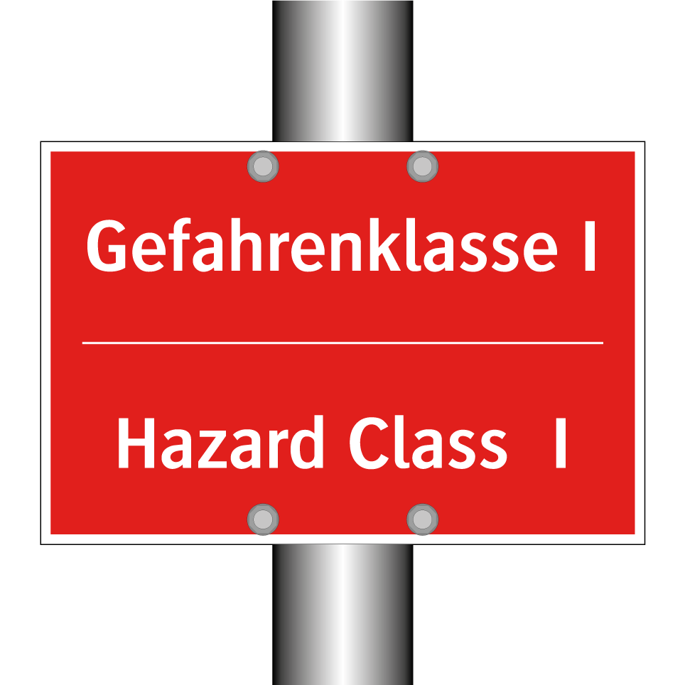 Zweisprachiges Brandschutzschild mit deutschem Text Gefahrenklasse I und englischem Text Hazard Class I