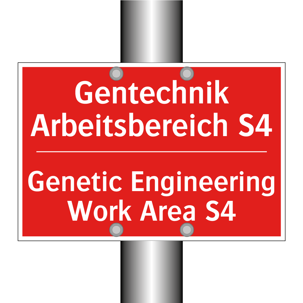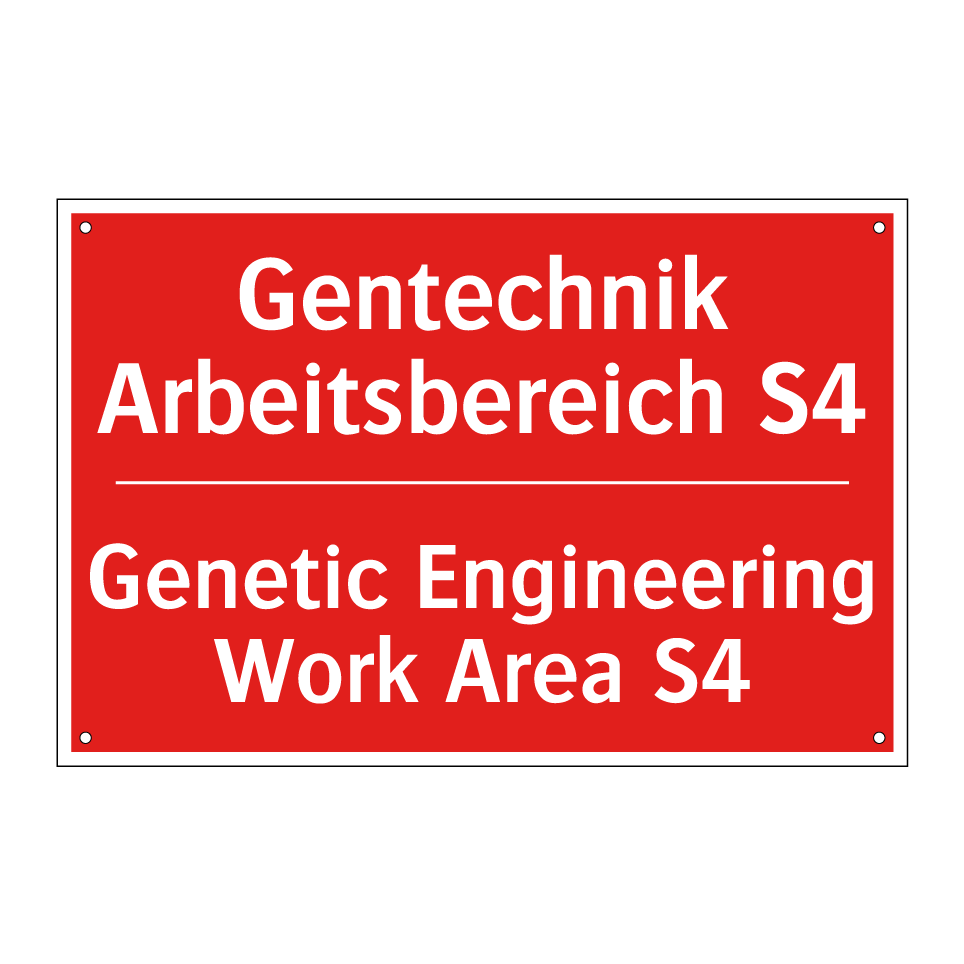Zweisprachiges Brandschutzschild mit deutschem Text Gentechnik Arbeitsbereich S4 und englischem Text Genetic Engineering Work Area S4