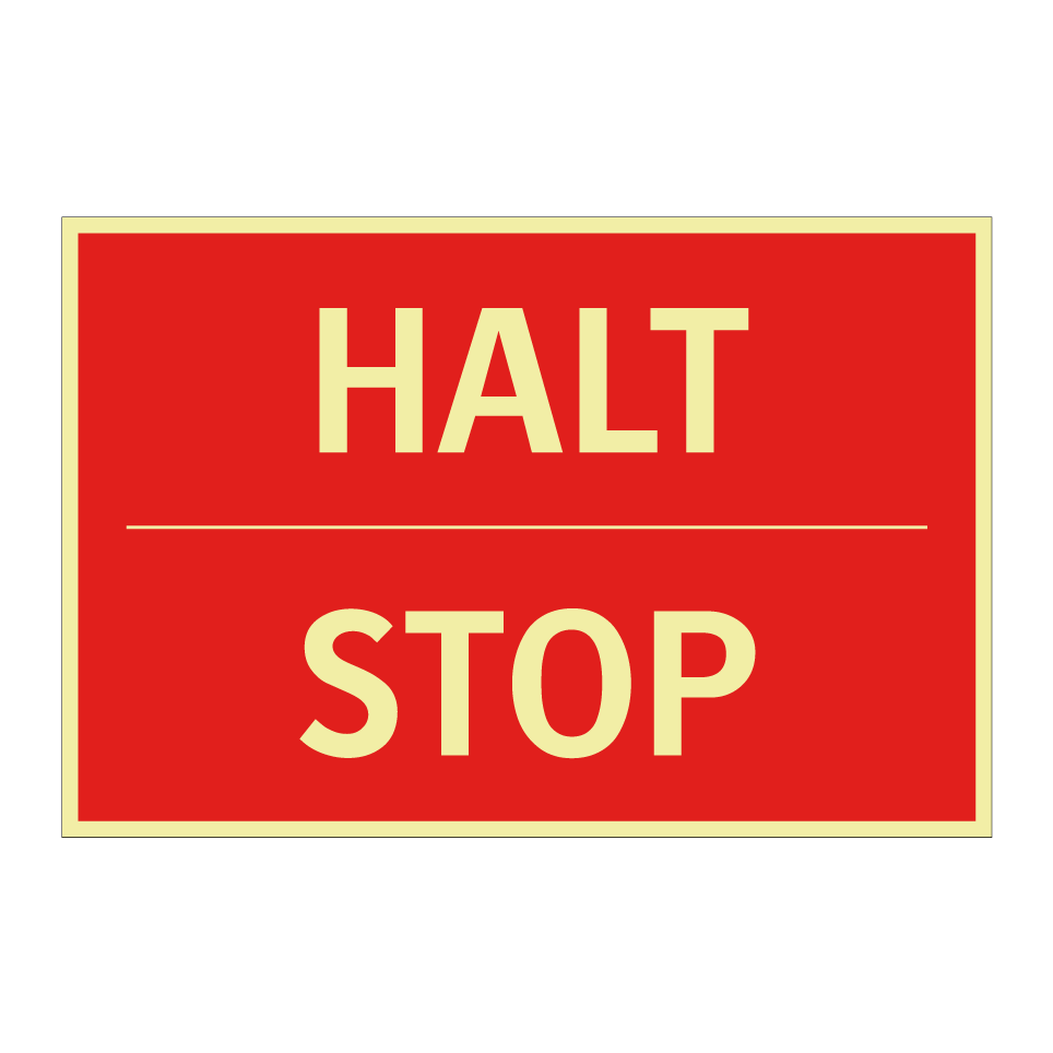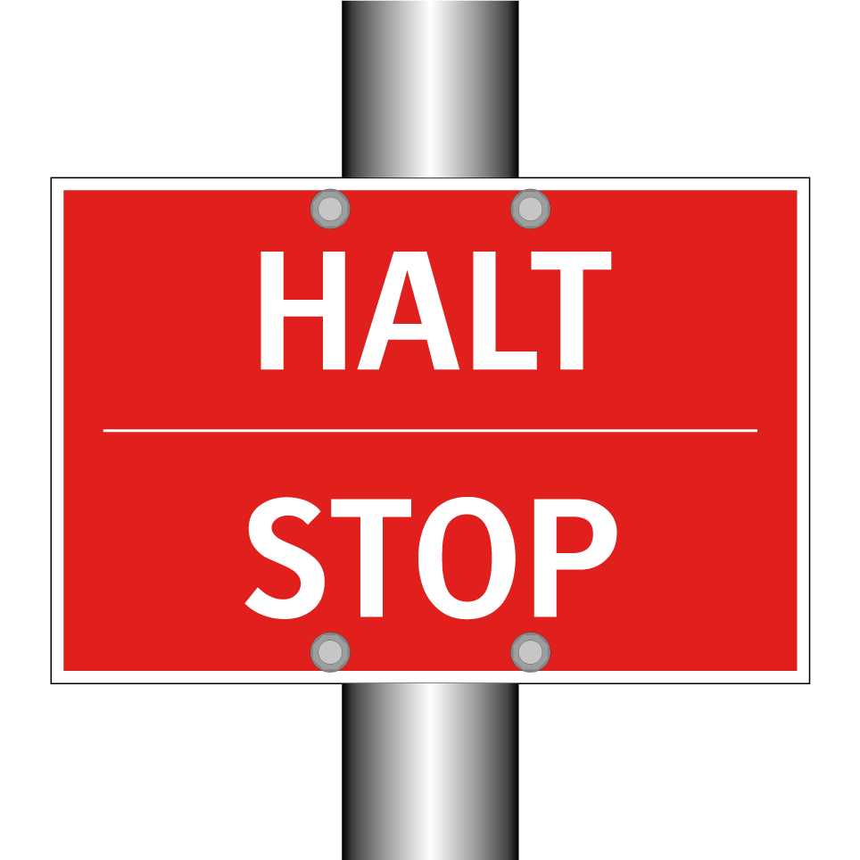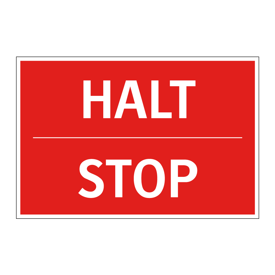 Zweisprachiges Brandschutzschild mit deutschem Text HALT und englischem Text STOP