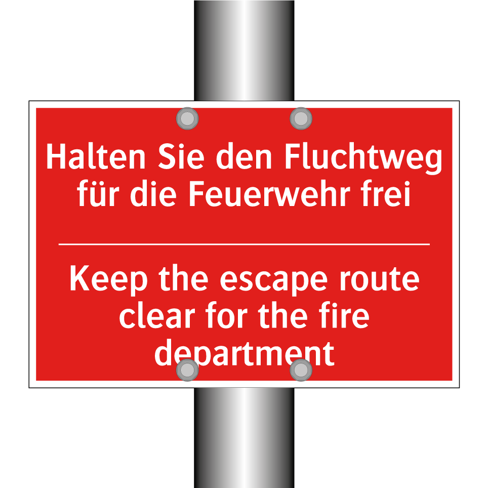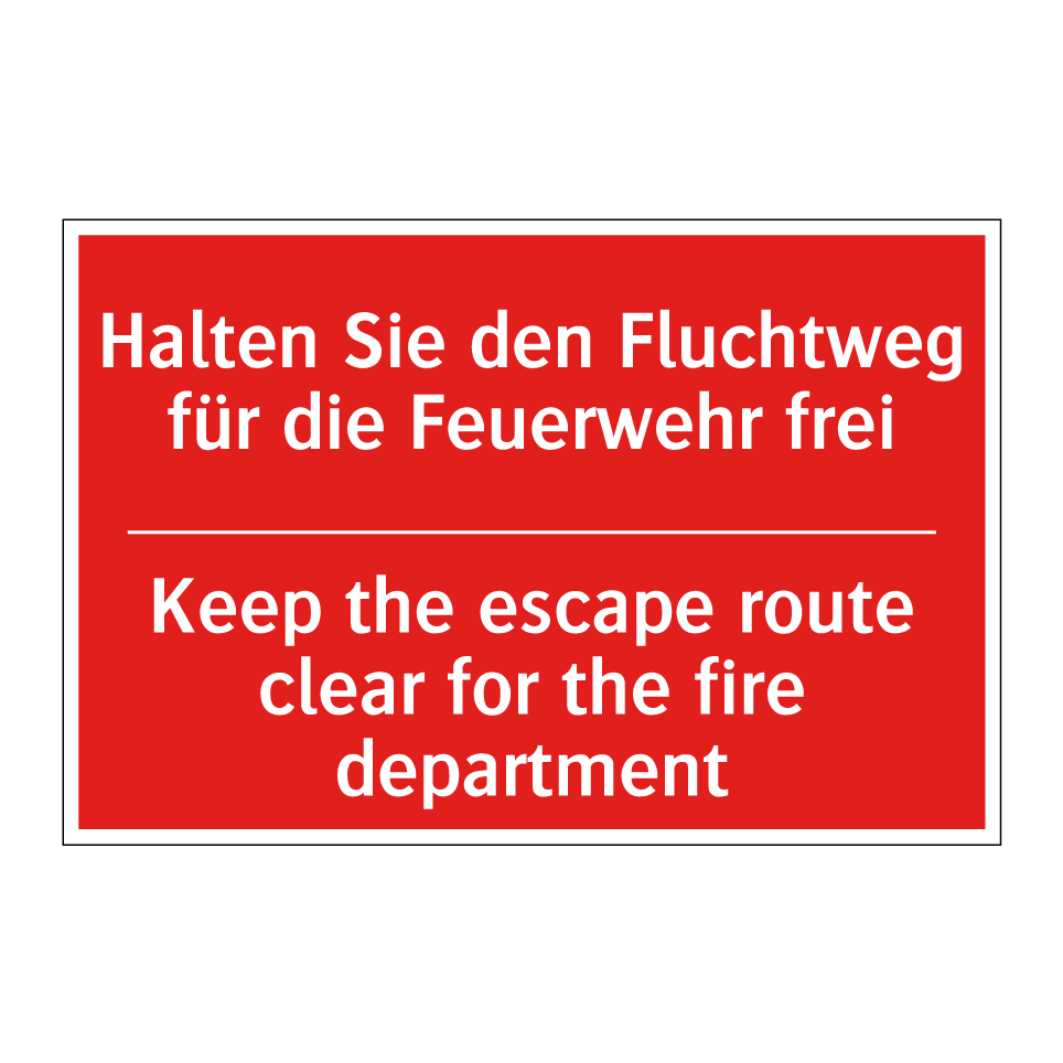 Zweisprachiges Brandschutzschild mit deutschem Text Halten Sie den Fluchtweg für die Feuerwehr frei und englischem Text Keep the escape route clear for the fire department