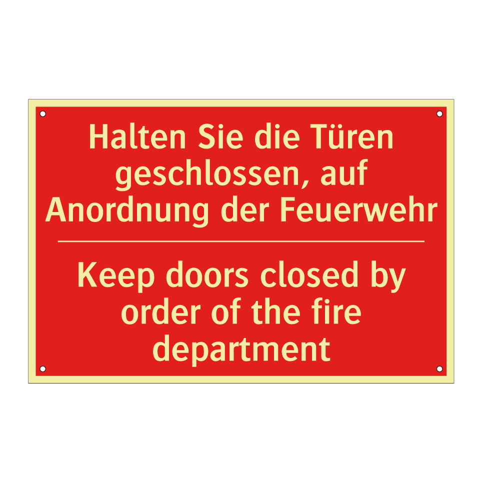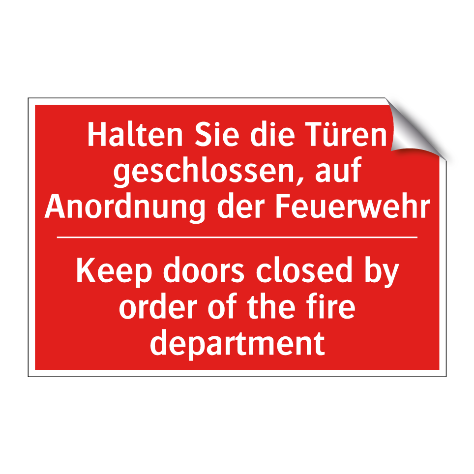 Zweisprachiges Brandschutzschild mit deutschem Text Halten Sie die Türen geschlossen, auf Anordnung der Feuerwehr und englischem Text Keep doors closed by order of the fire department
