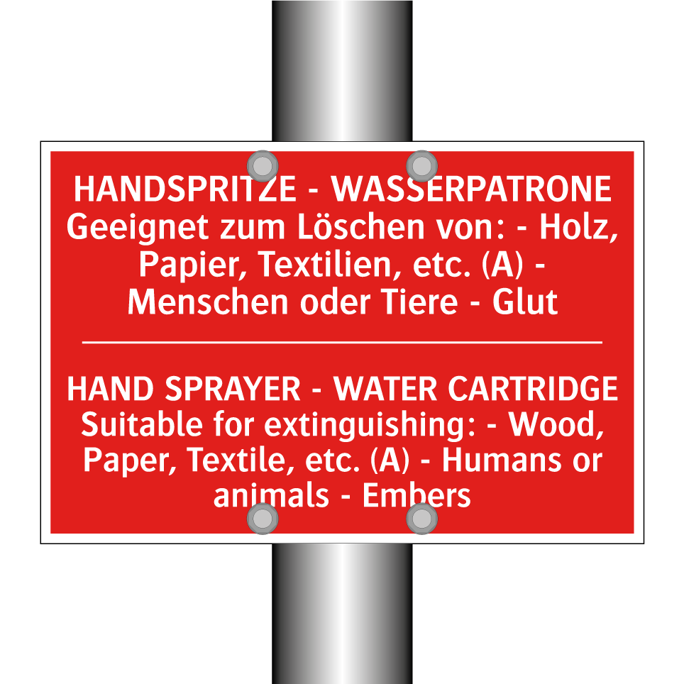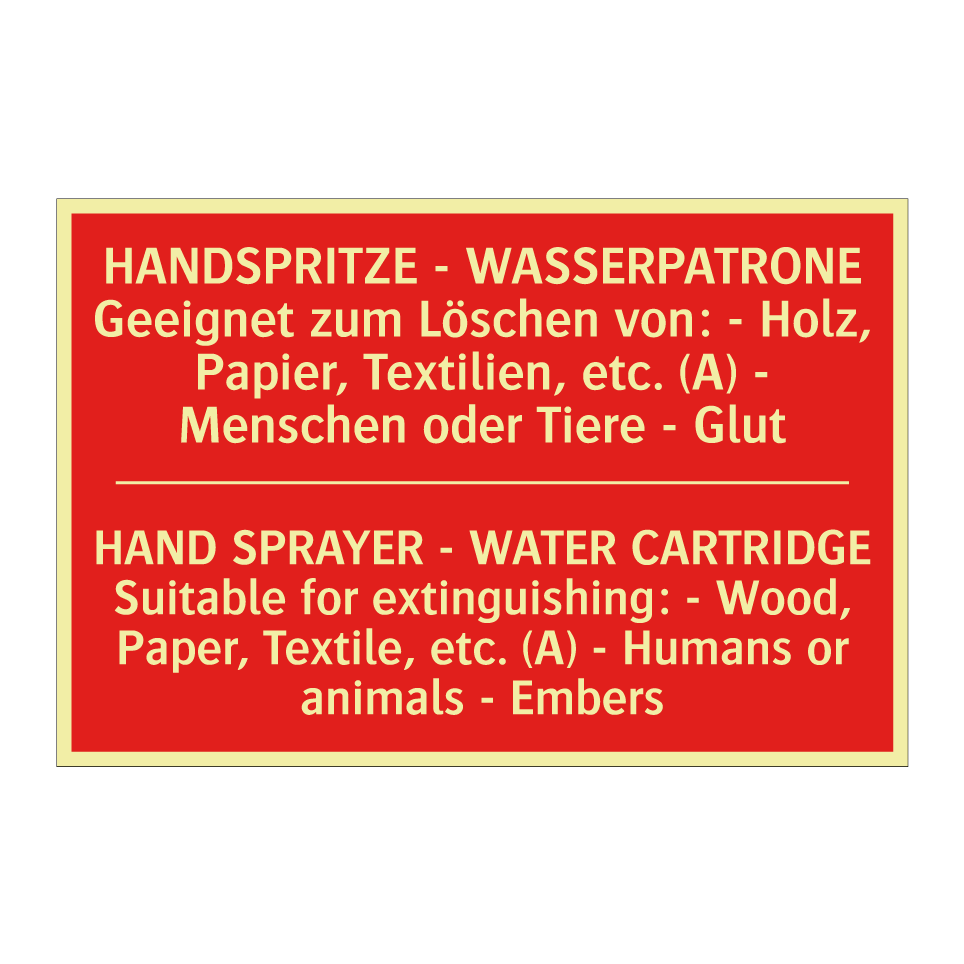 Zweisprachiges Brandschutzschild mit deutschem Text HANDSPRITZE - WASSERPATRONE Geeignet zum Löschen von: - Holz, Papier, Textilien, etc. (A) - Menschen oder Tiere - Glut und englischem Text HAND SPRAYER - WATER CARTRIDGE Suitable for extinguishing: - Wood, Paper, Textile, etc. (A) - Humans or animals - Embers
