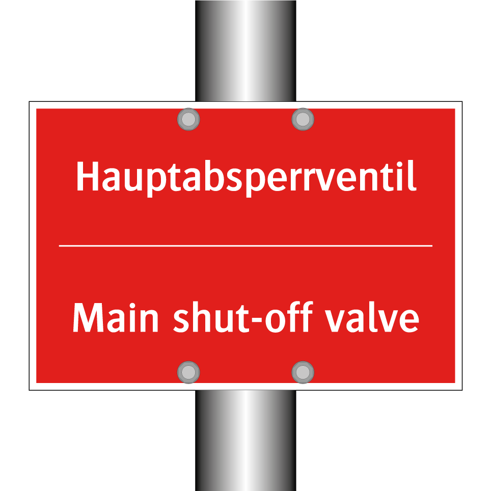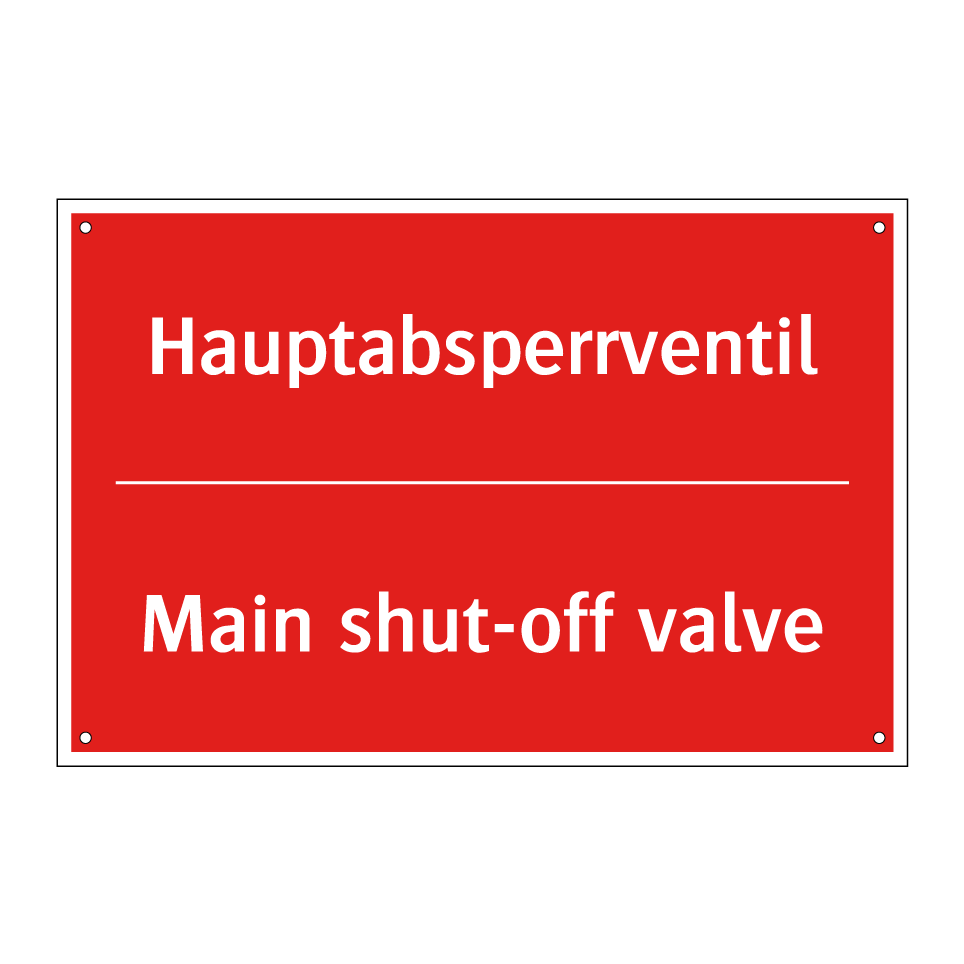 Zweisprachiges Brandschutzschild mit deutschem Text Hauptabsperrventil und englischem Text Main shut-off valve