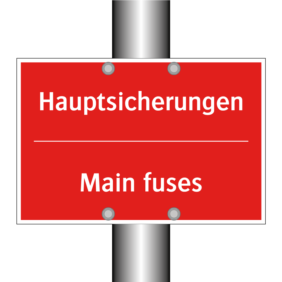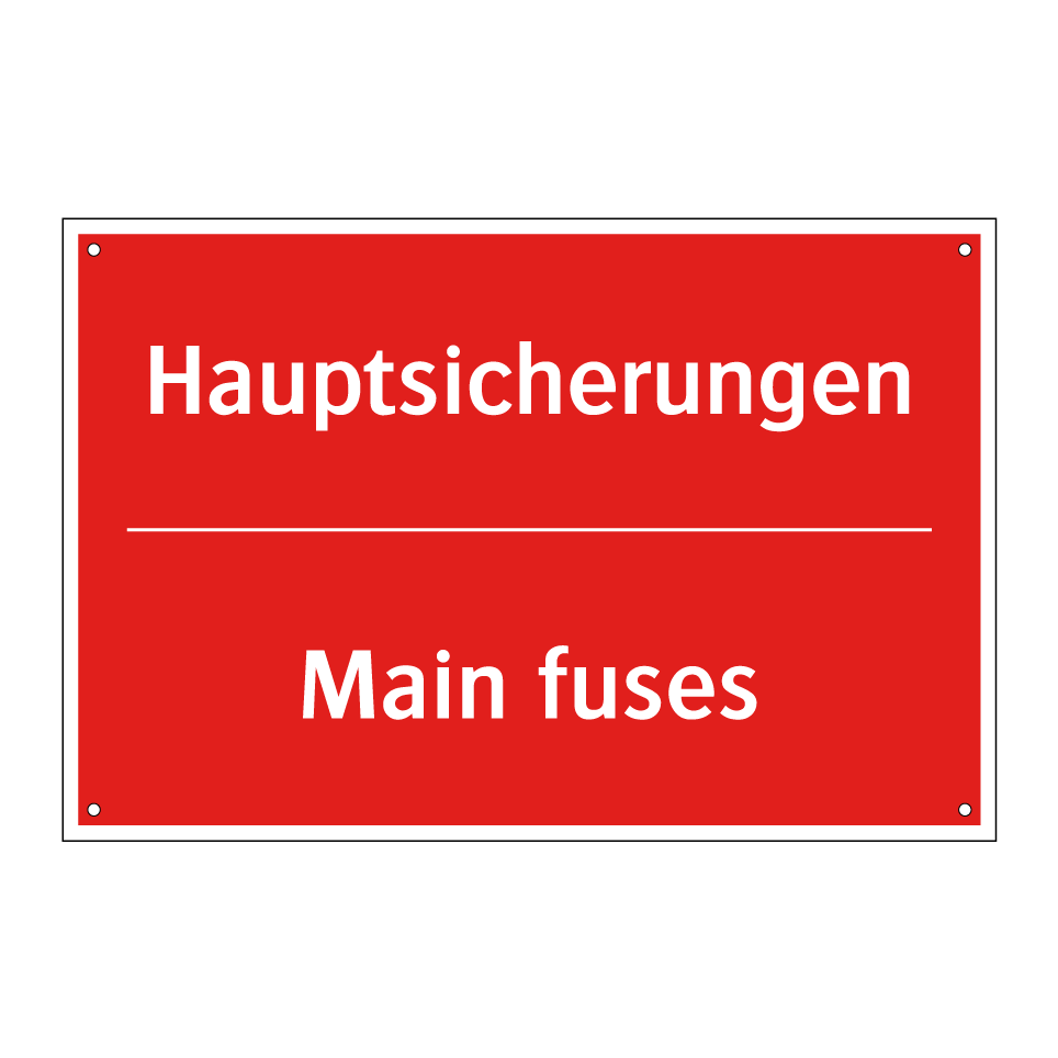 Zweisprachiges Brandschutzschild mit deutschem Text Hauptsicherungen und englischem Text Main fuses