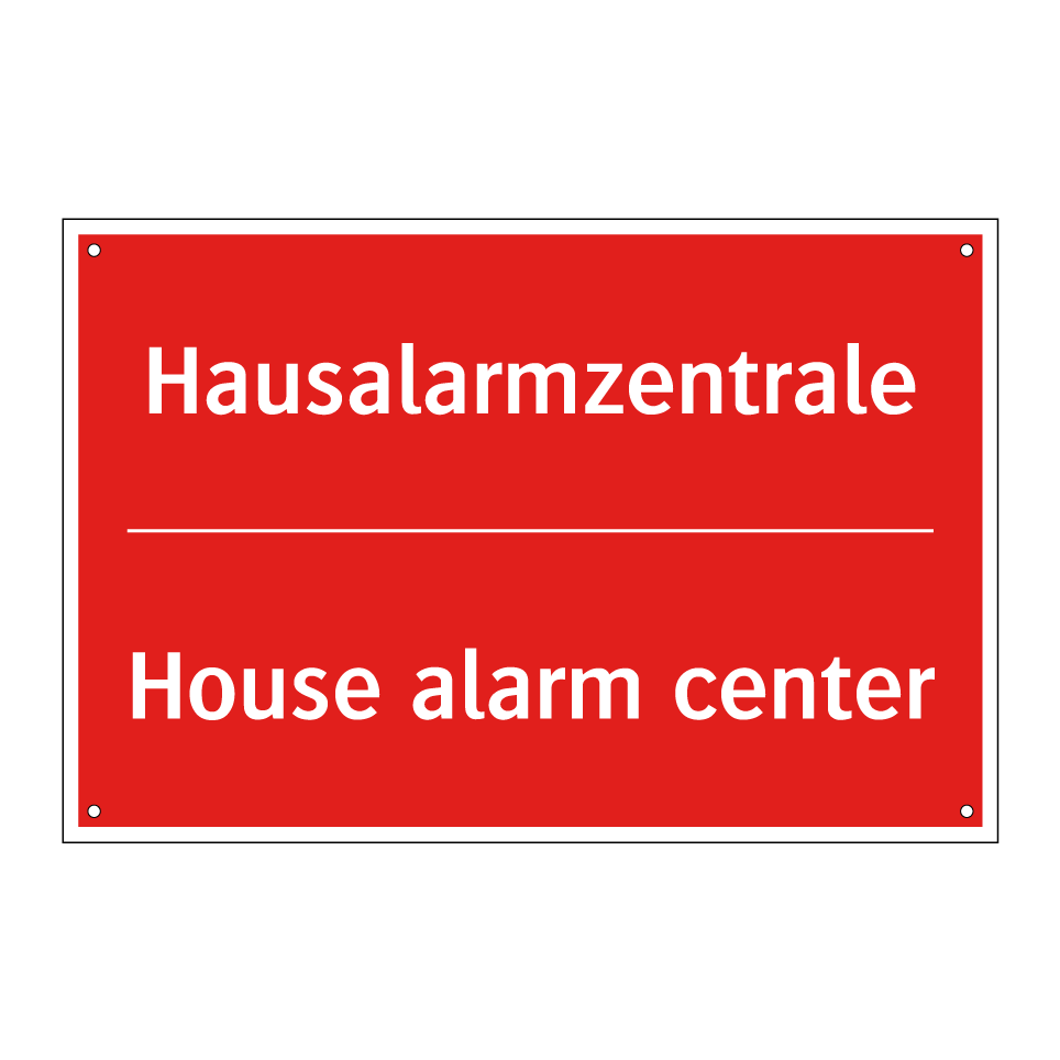 Zweisprachiges Brandschutzschild mit deutschem Text Hausalarmzentrale und englischem Text House alarm center