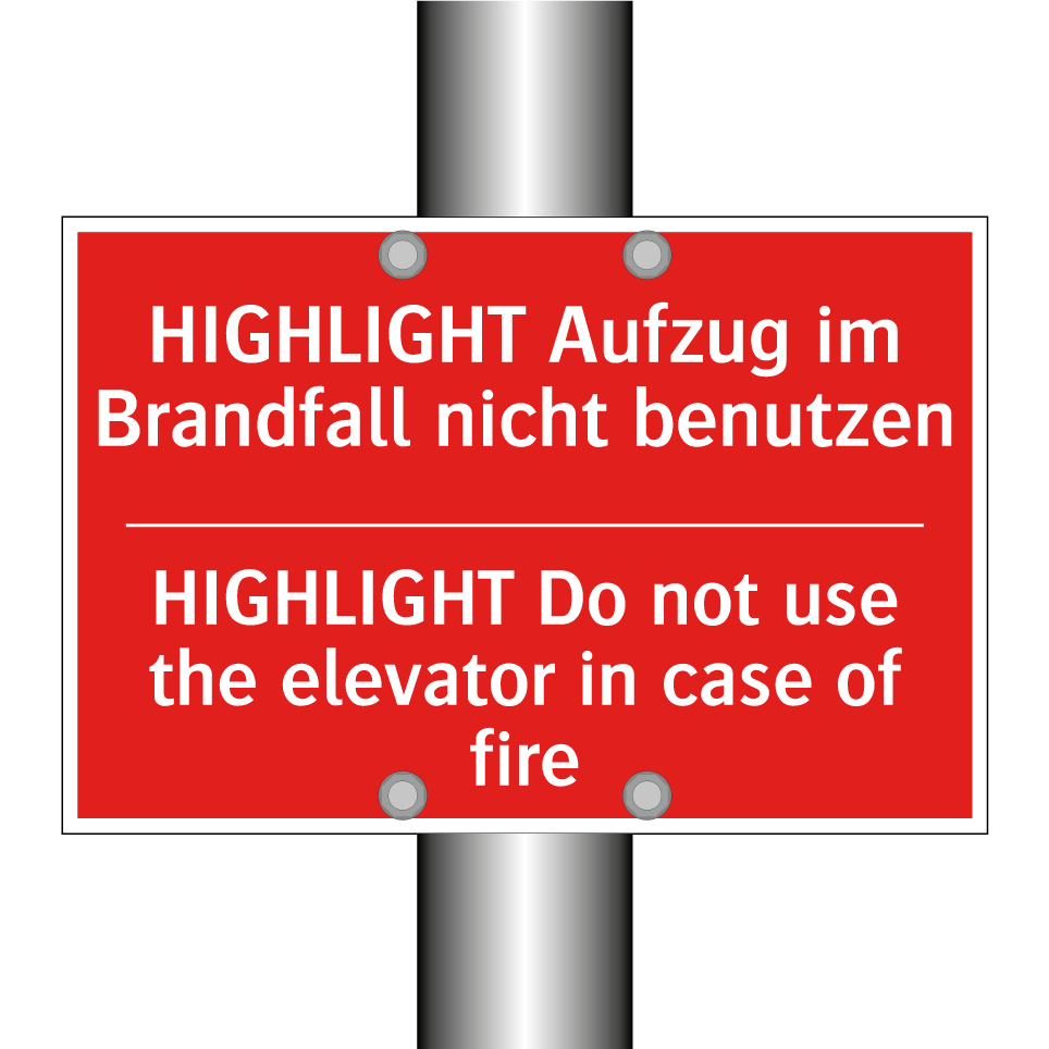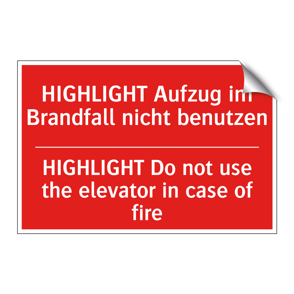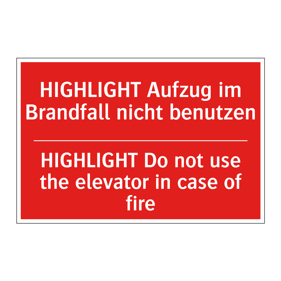 Zweisprachiges Brandschutzschild mit deutschem Text HIGHLIGHT Aufzug im Brandfall nicht benutzen und englischem Text HIGHLIGHT Do not use the elevator in case of fire