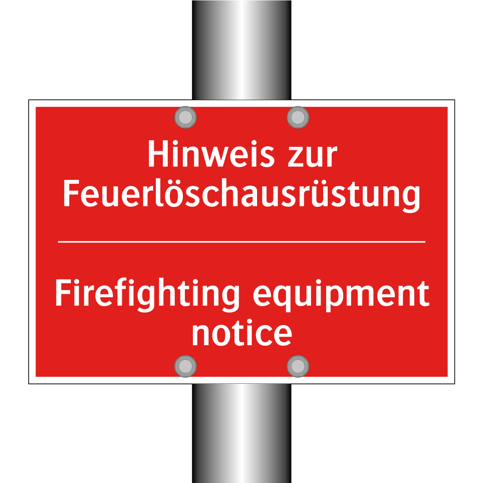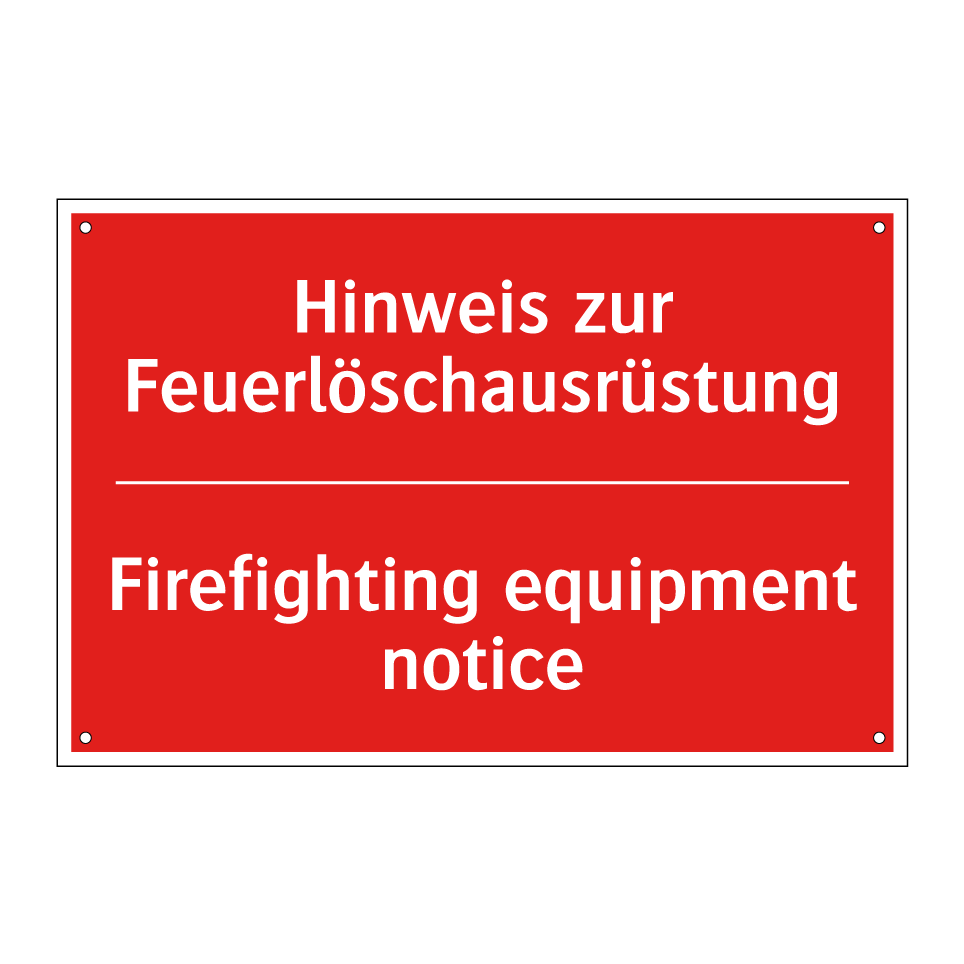 Zweisprachiges Brandschutzschild mit deutschem Text Hinweis zur Feuerlöschausrüstung und englischem Text Firefighting equipment notice
