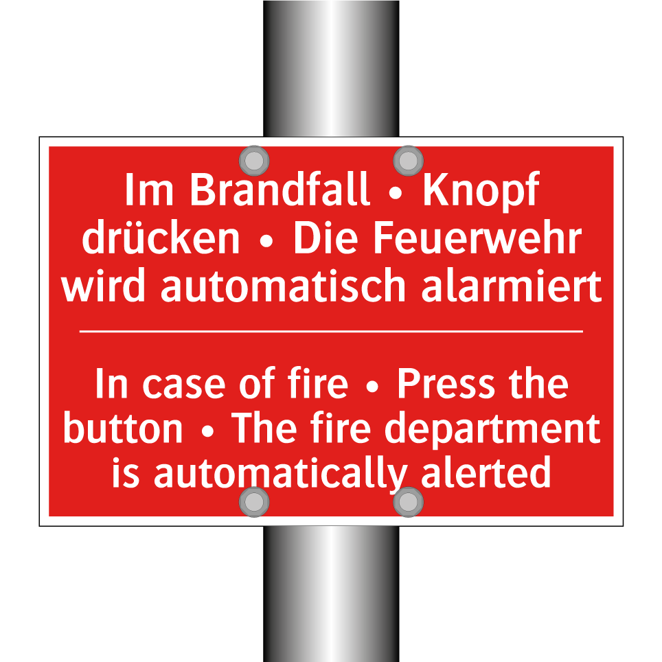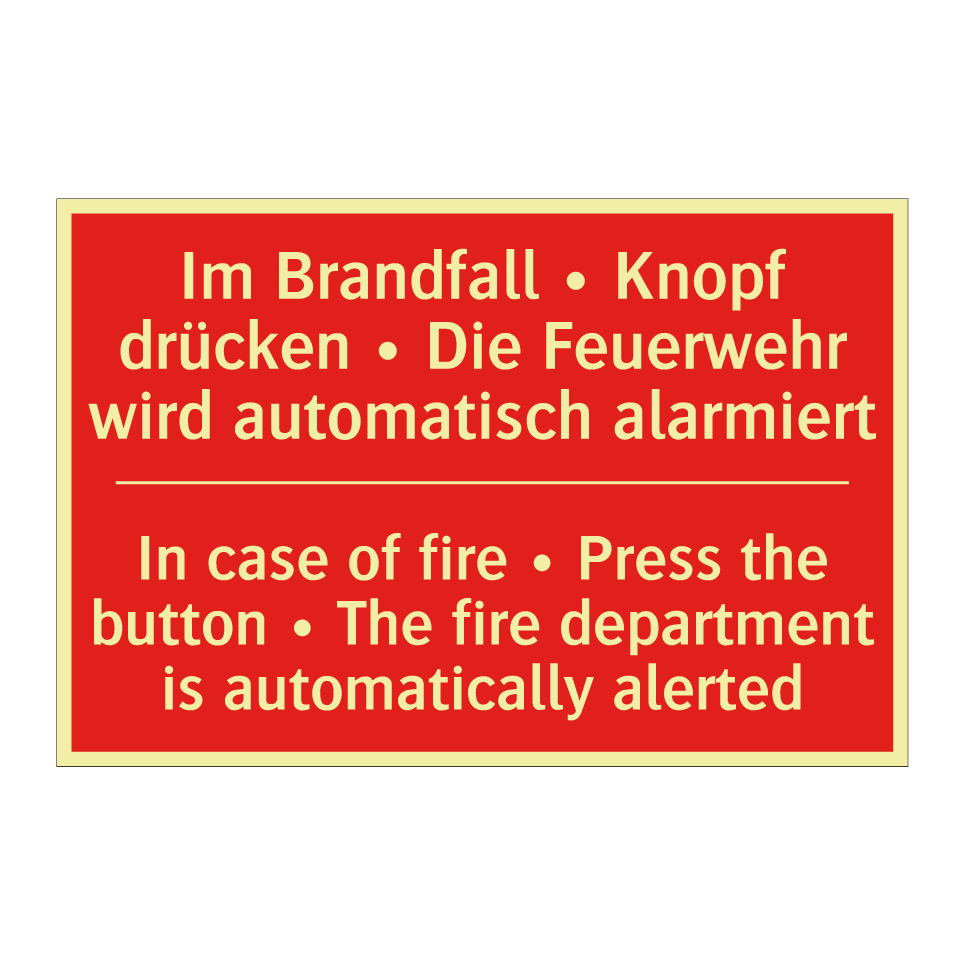 Zweisprachiges Brandschutzschild mit deutschem Text Im Brandfall • Knopf drücken • Die Feuerwehr wird automatisch alarmiert und englischem Text In case of fire • Press the button • The fire department is automatically alerted
