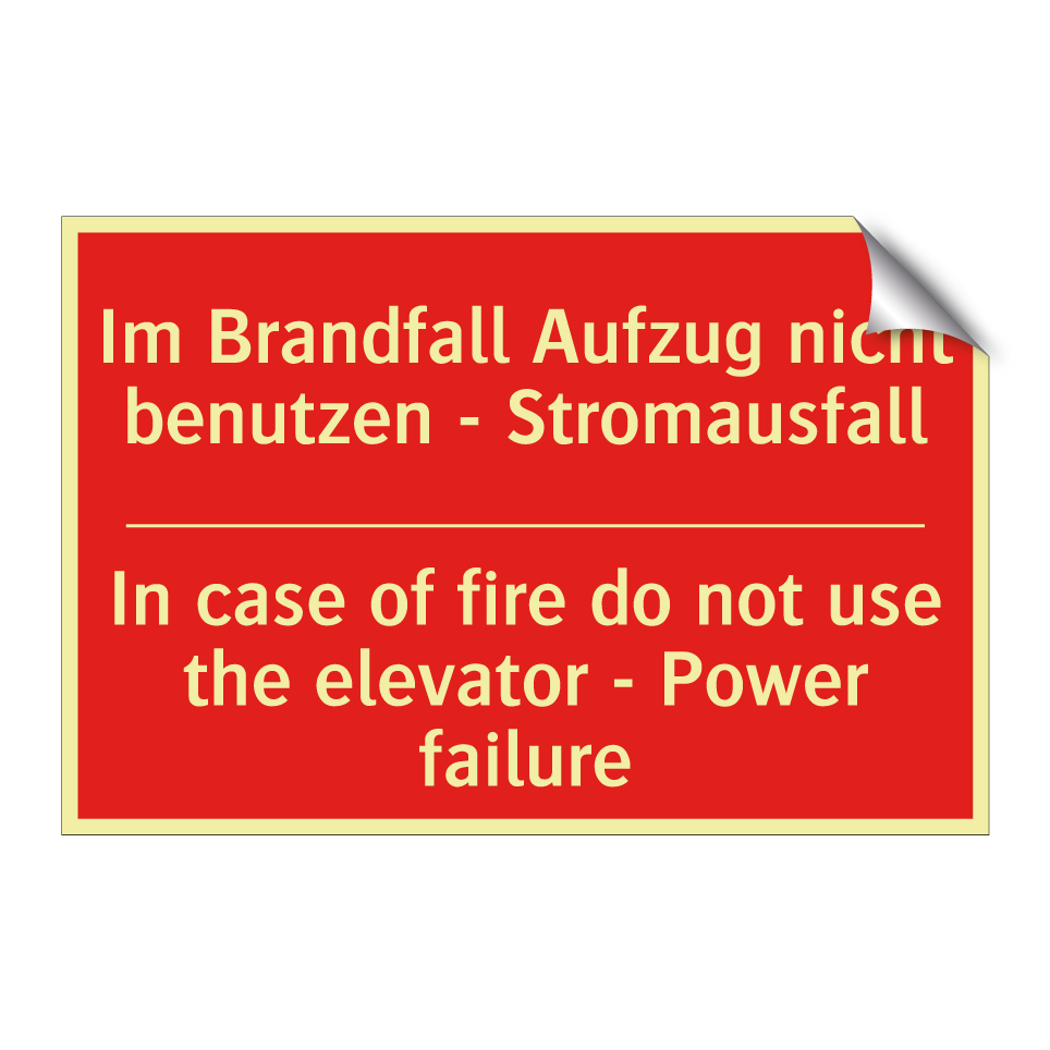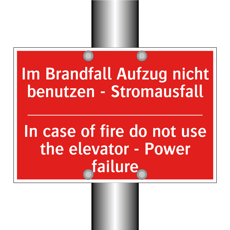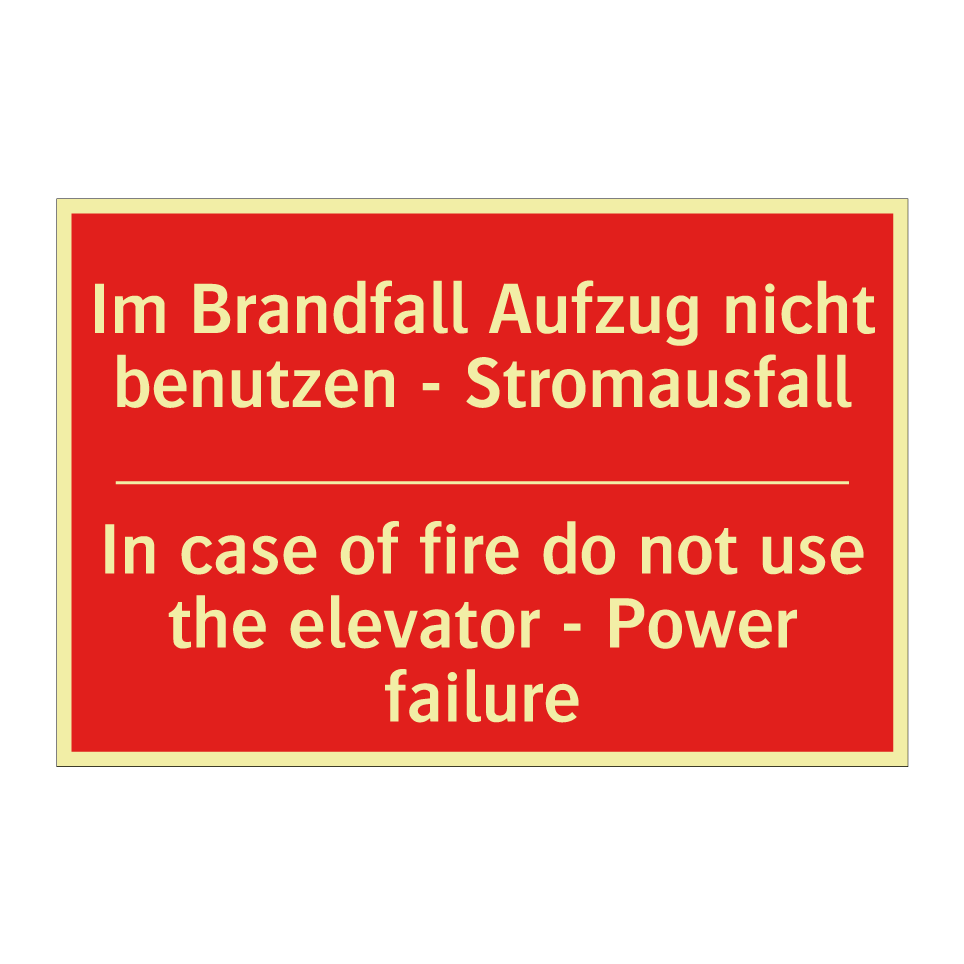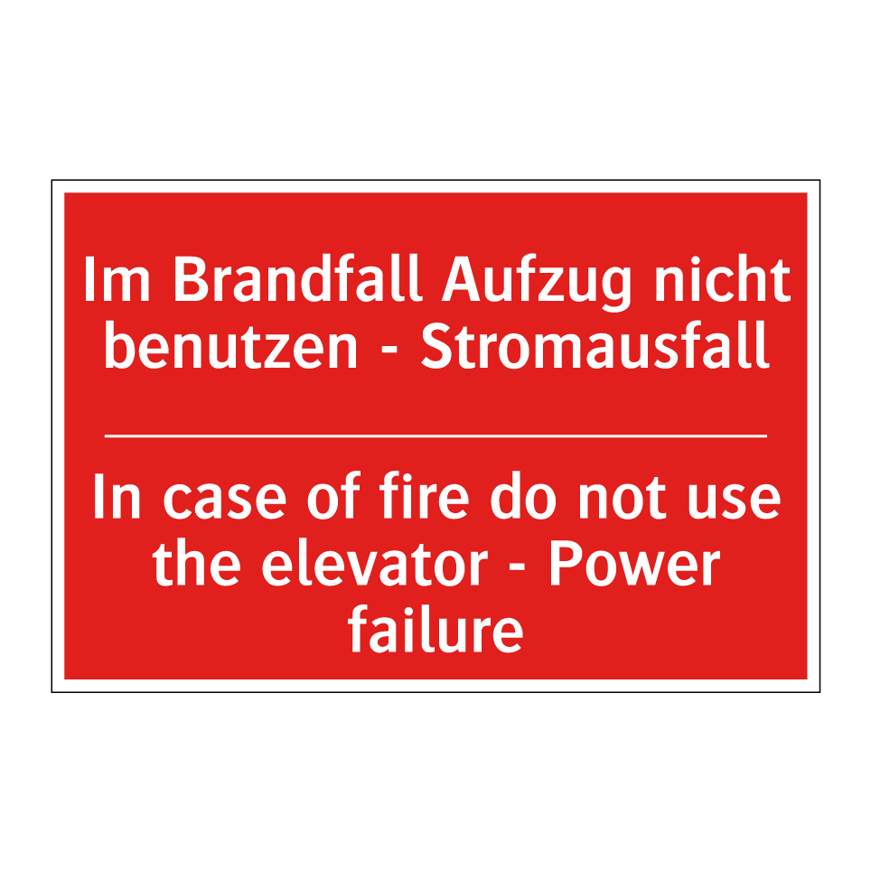 Zweisprachiges Brandschutzschild mit deutschem Text Im Brandfall Aufzug nicht benutzen - Stromausfall und englischem Text In case of fire do not use the elevator - Power failure