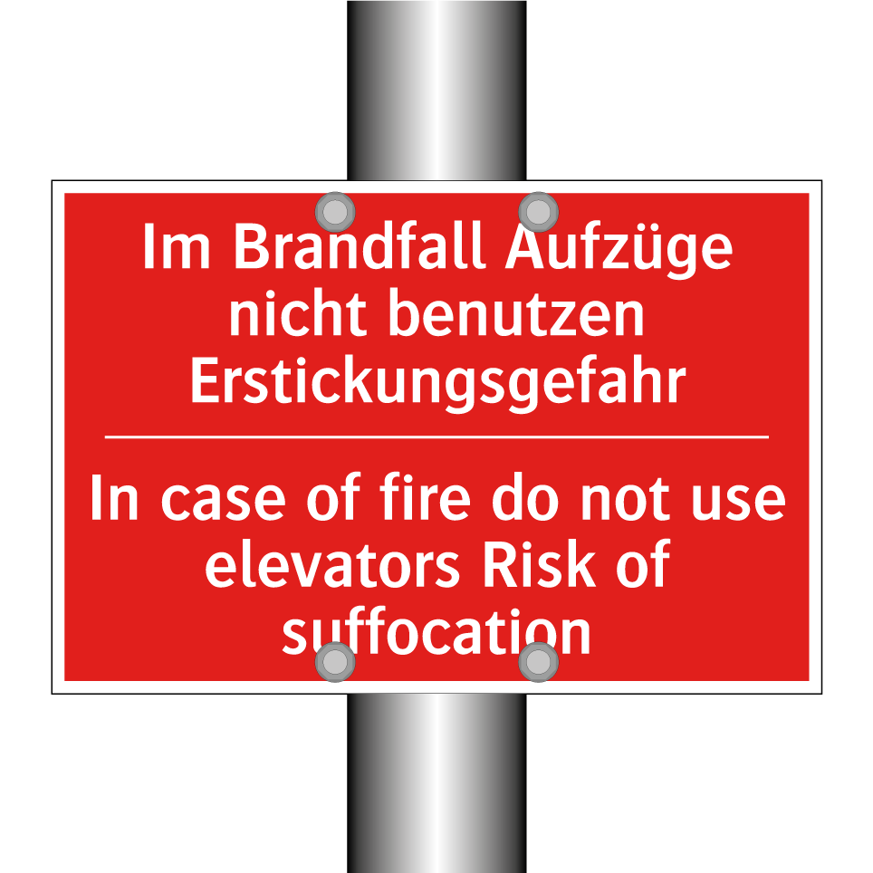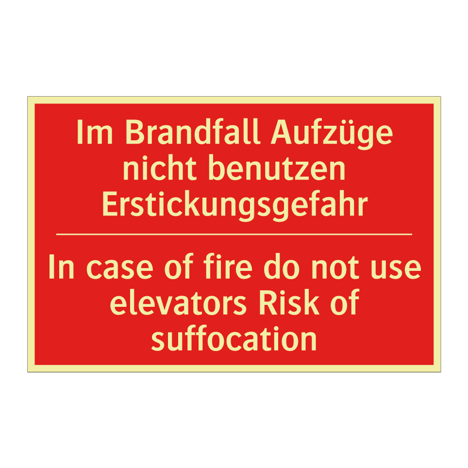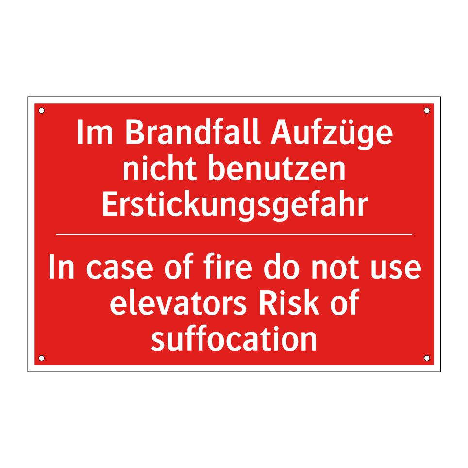 Zweisprachiges Brandschutzschild mit deutschem Text Im Brandfall Aufzüge nicht benutzen Erstickungsgefahr und englischem Text In case of fire do not use elevators Risk of suffocation