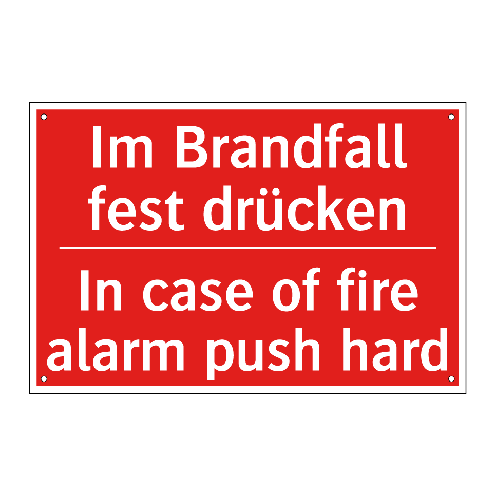 Zweisprachiges Brandschutzschild mit deutschem Text Im Brandfall fest drücken und englischem Text In case of fire alarm push hard