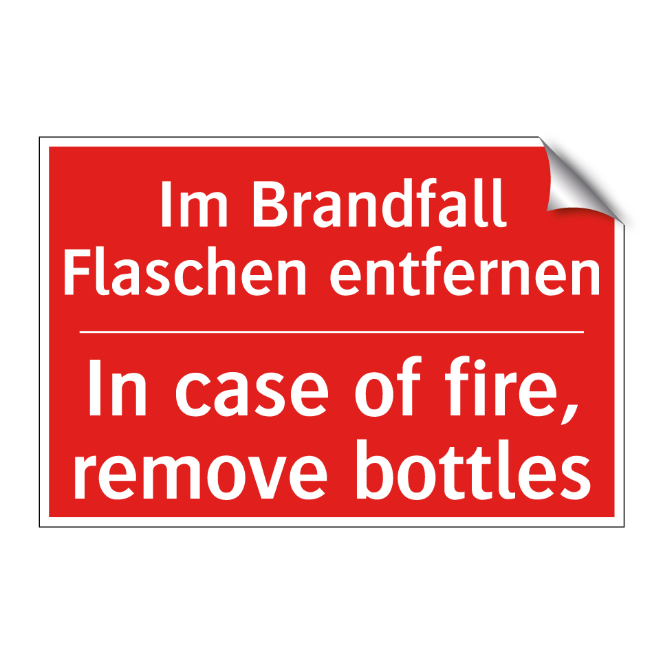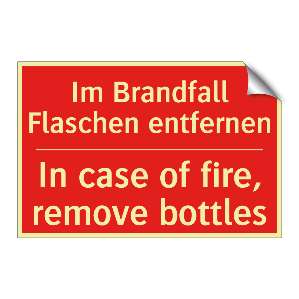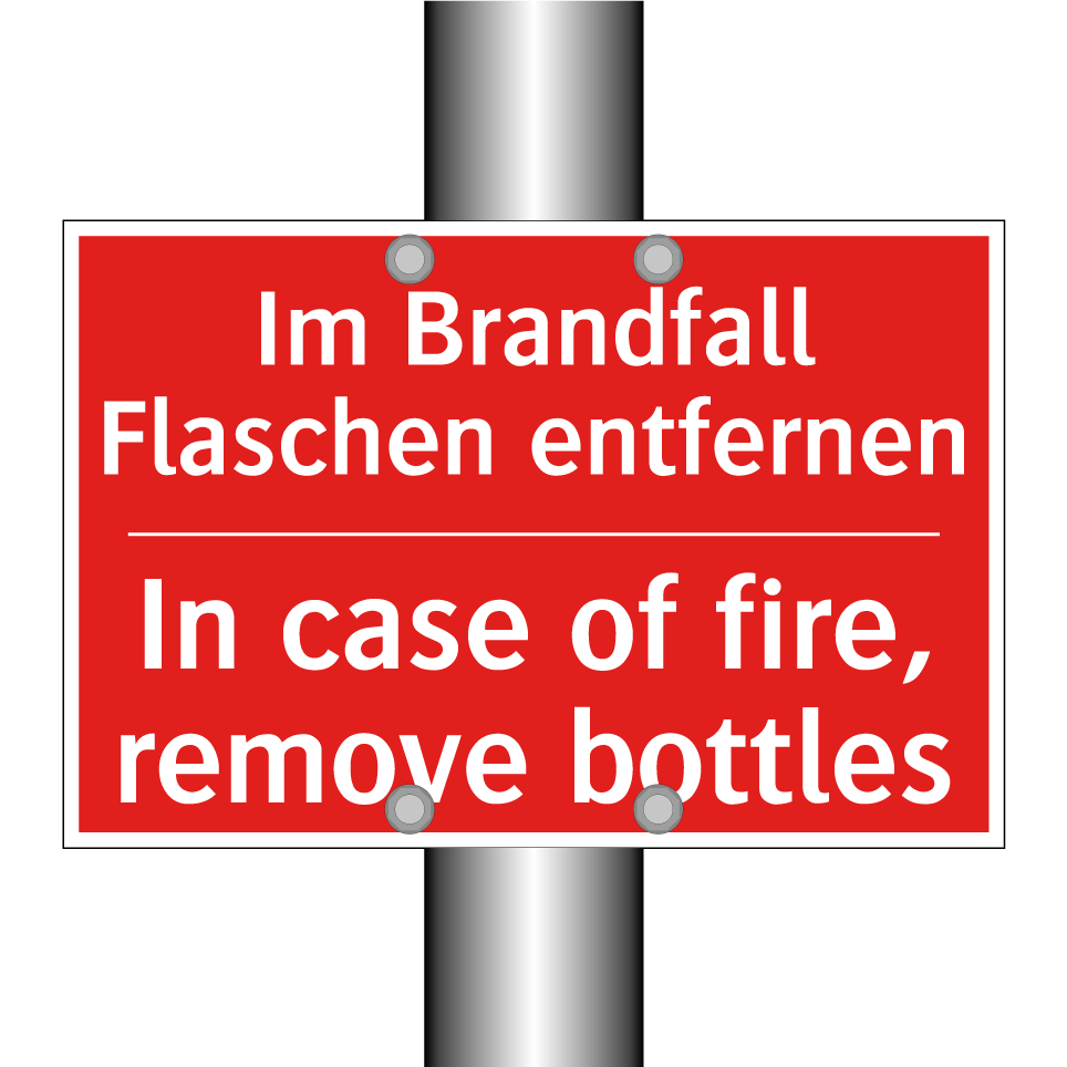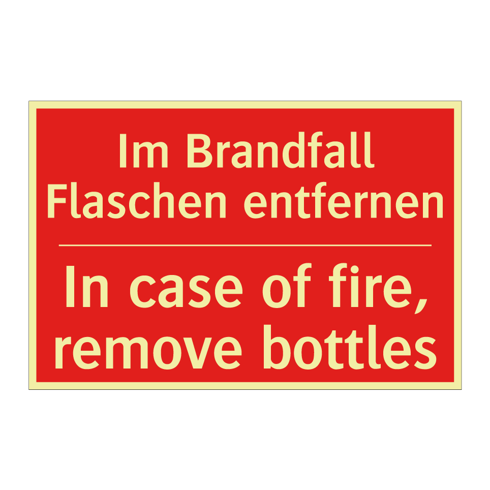 Zweisprachiges Brandschutzschild mit deutschem Text Im Brandfall Flaschen entfernen und englischem Text In case of fire, remove bottles