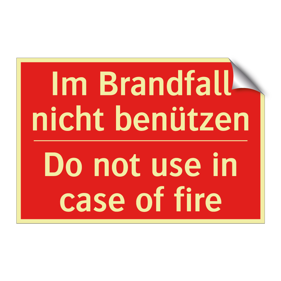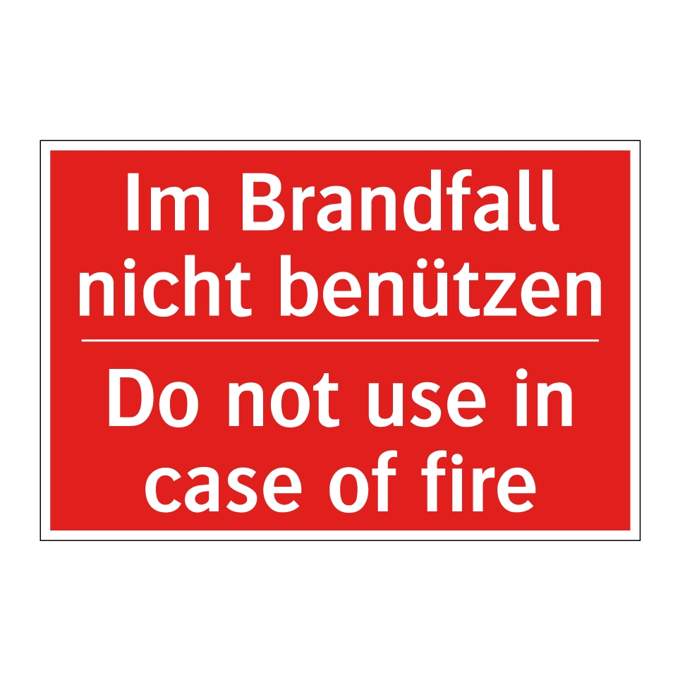 Zweisprachiges Brandschutzschild mit deutschem Text Im Brandfall nicht benützen und englischem Text Do not use in case of fire