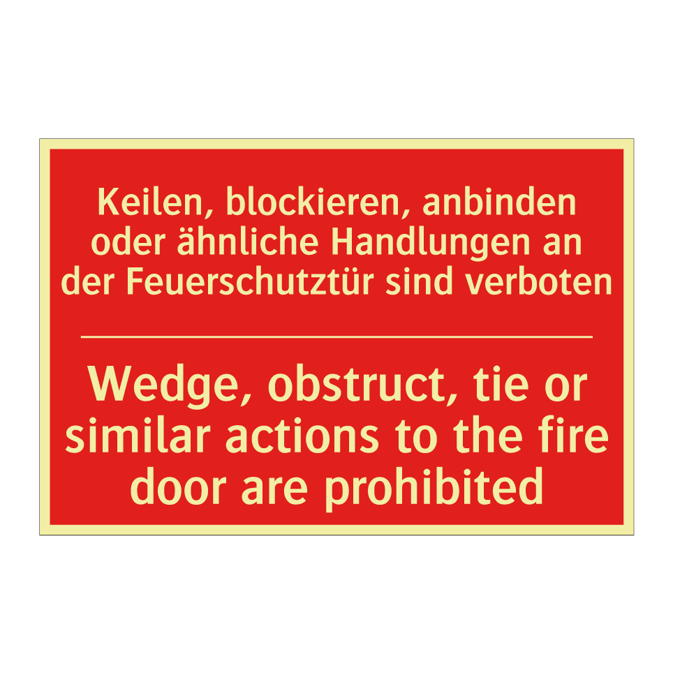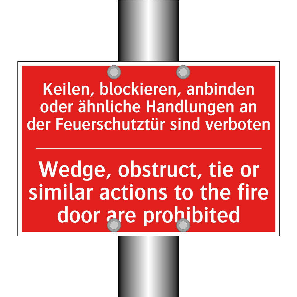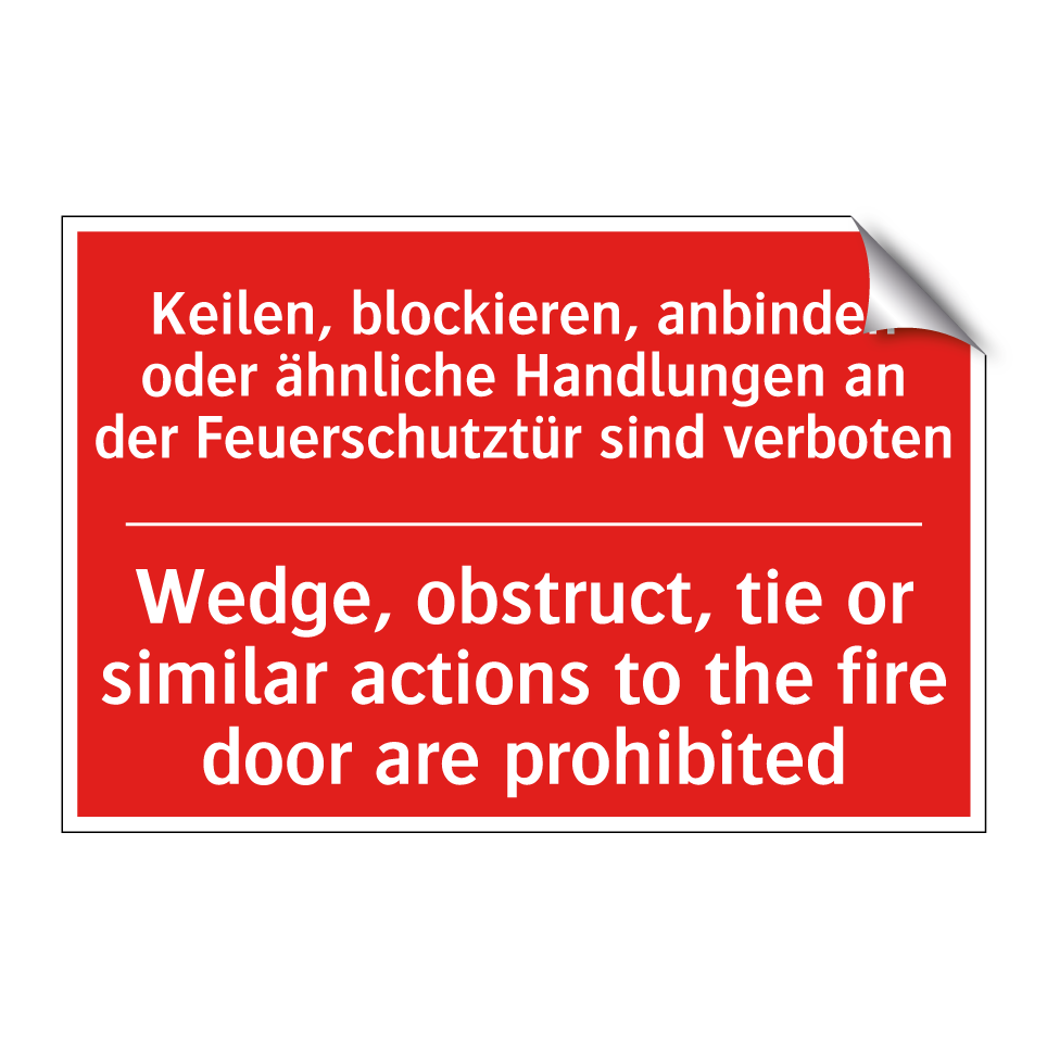 Zweisprachiges Brandschutzschild mit deutschem Text Keilen, blockieren, anbinden oder ähnliche Handlungen an der Feuerschutztür sind verboten und englischem Text Wedge, obstruct, tie or similar actions to the fire door are prohibited